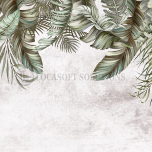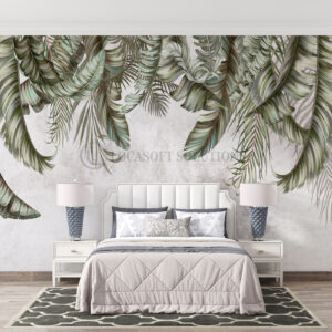 Papier peint panoramique feuillage tropical vert sauge – tête de lit nature chic