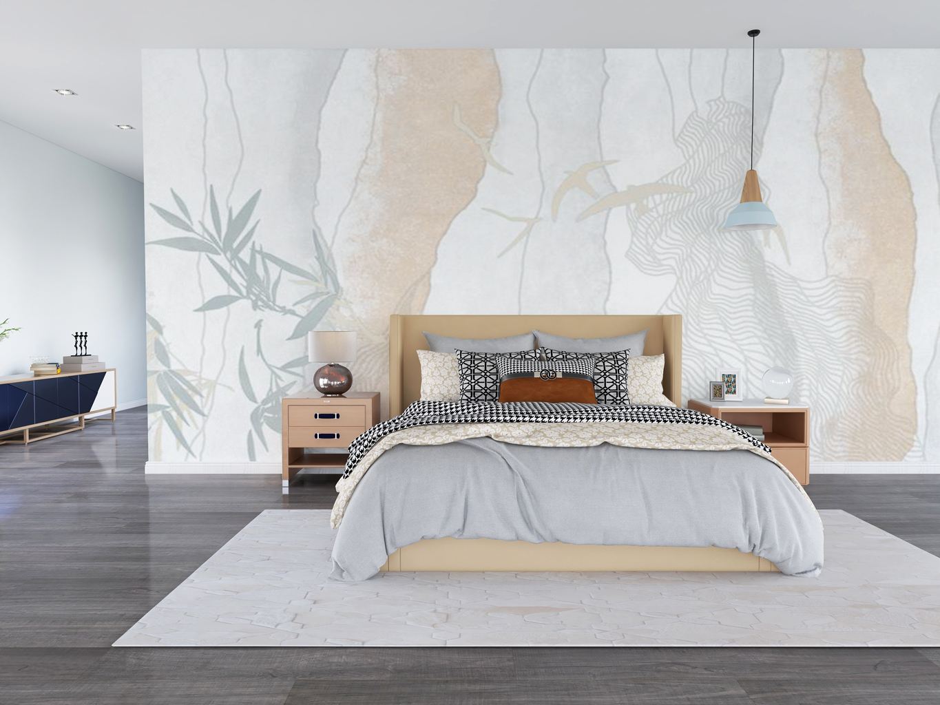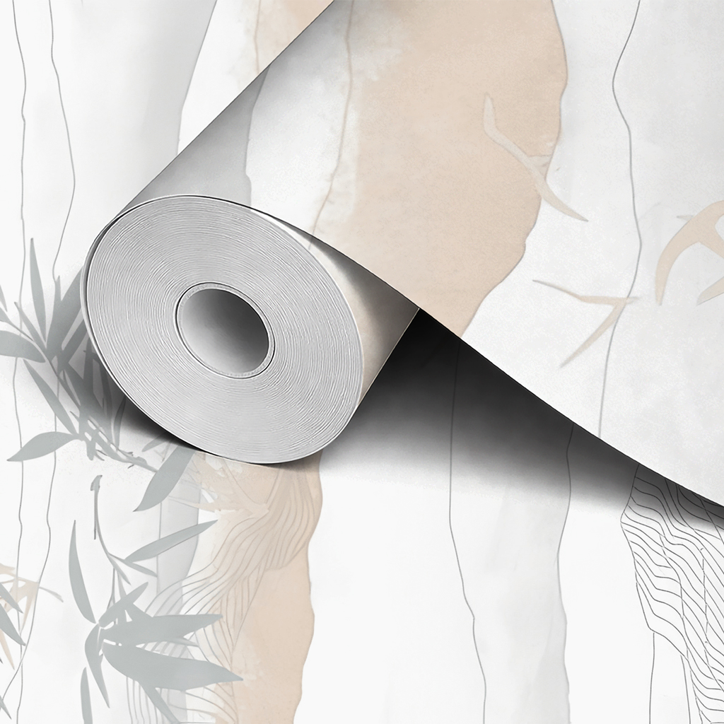 Papier peint à feuilles abstraites beige et gris pour une décoration moderne et apaisante.