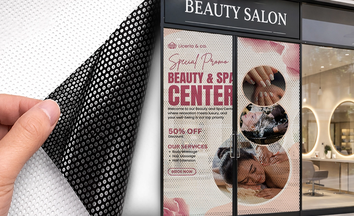 Le one way vision est un film adhésif perforé qui permet de voir depuis l’intérieur vers l’extérieur, tout en affichant une publicité visible de l’extérieur.
