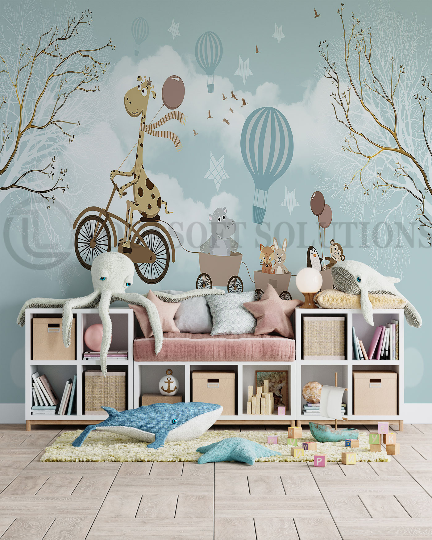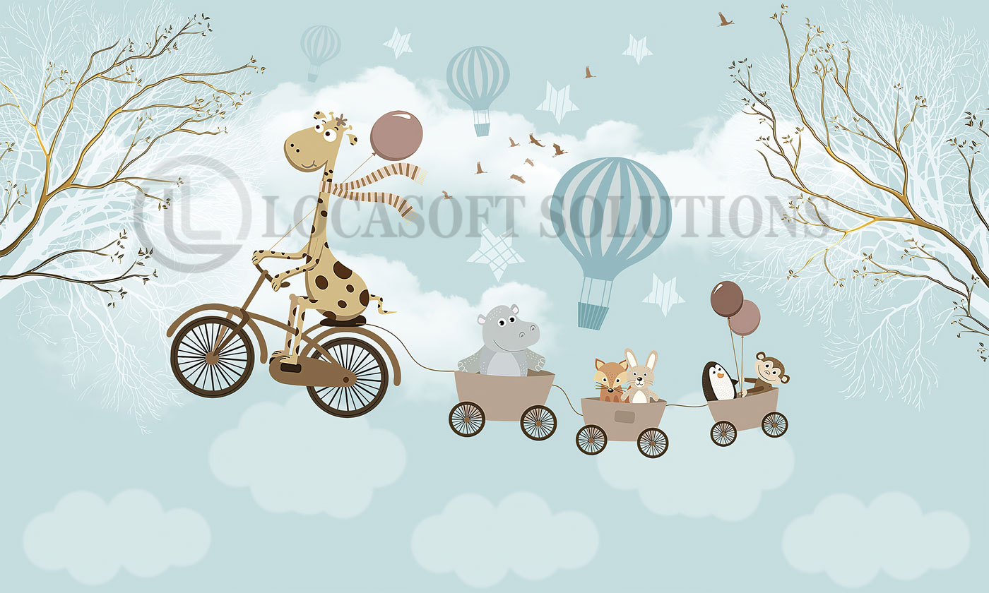 Papier peint animaux montgolfières – aventure poétique bleu pastel