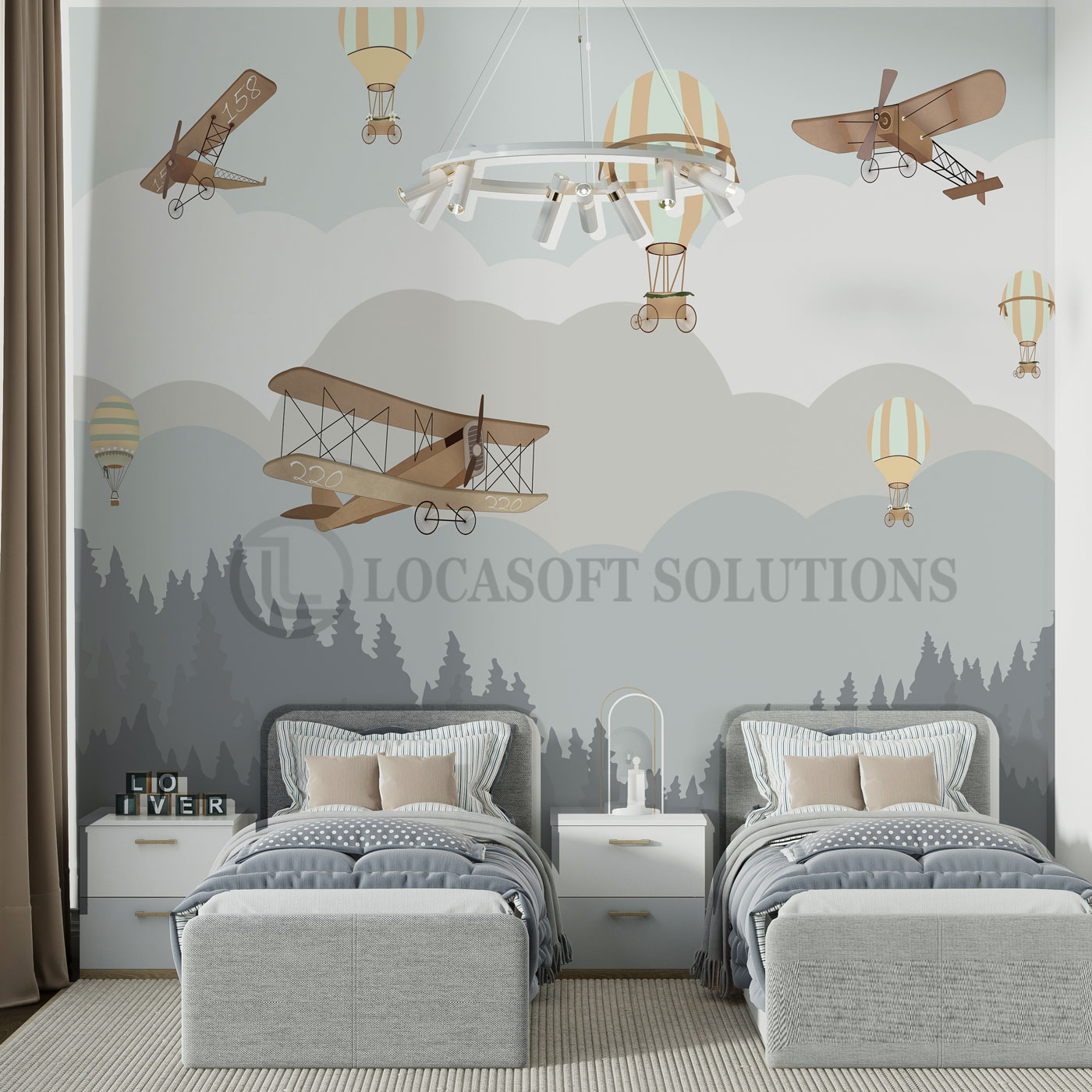 Papier peint avions vintage et montgolfières – ciel doux chambre enfant