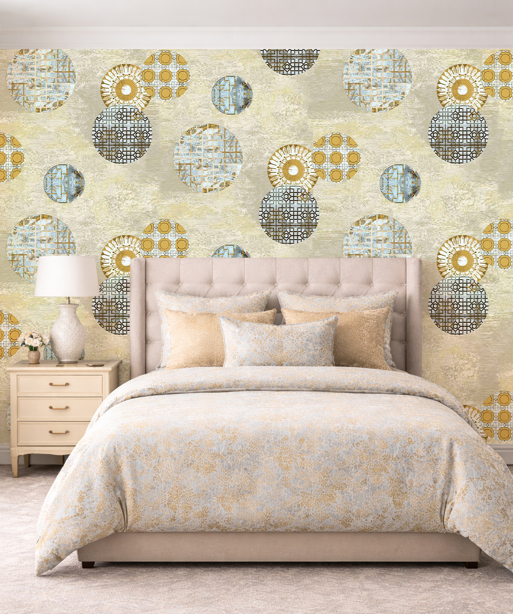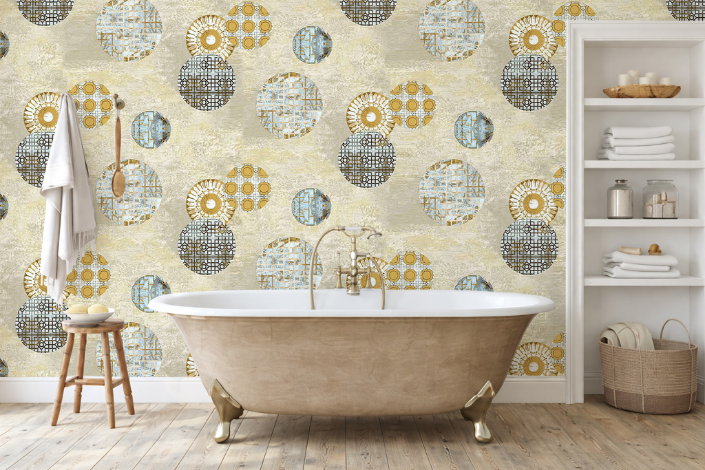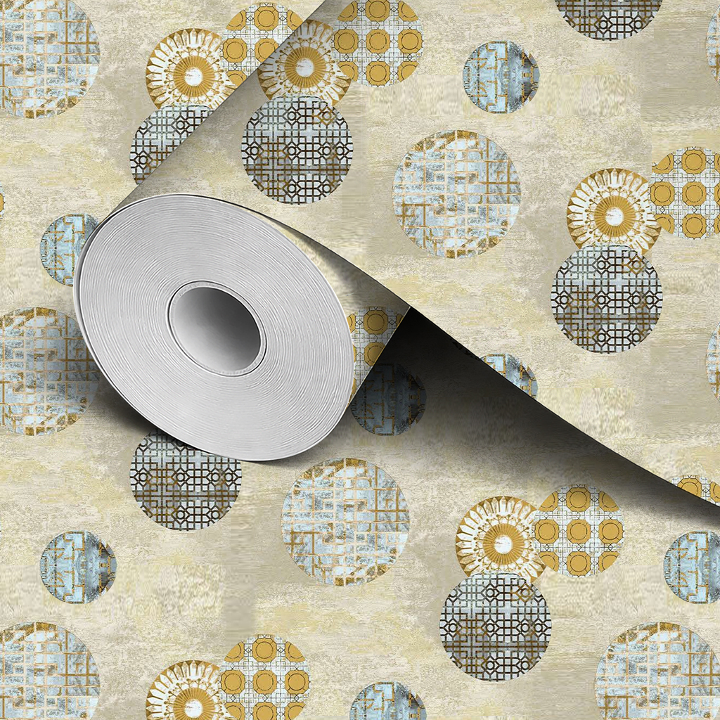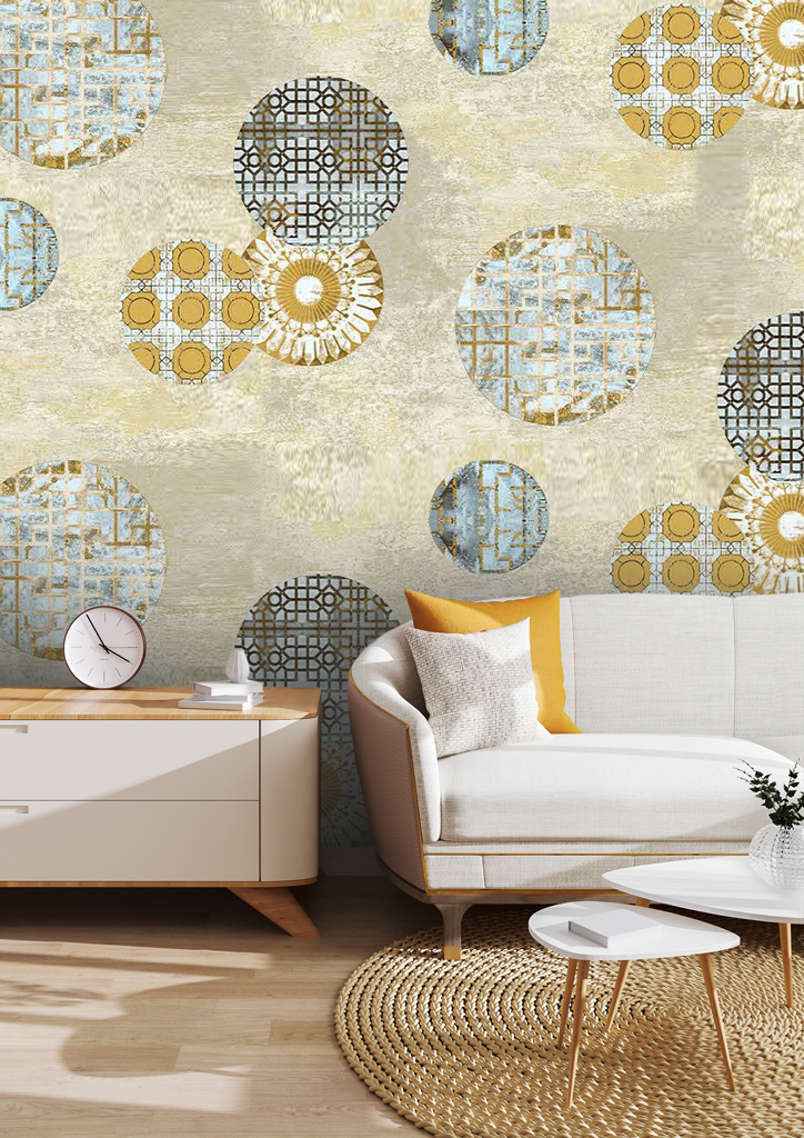 Papier peint à motifs de cercles géométriques beige, bleu et doré pour une décoration moderne et élégante.