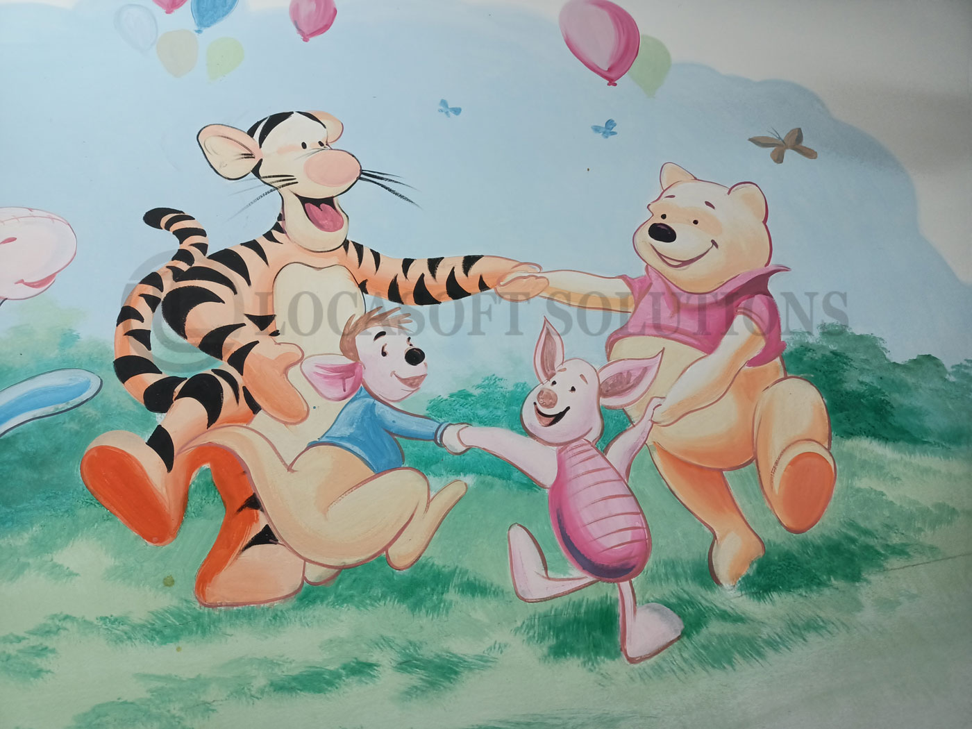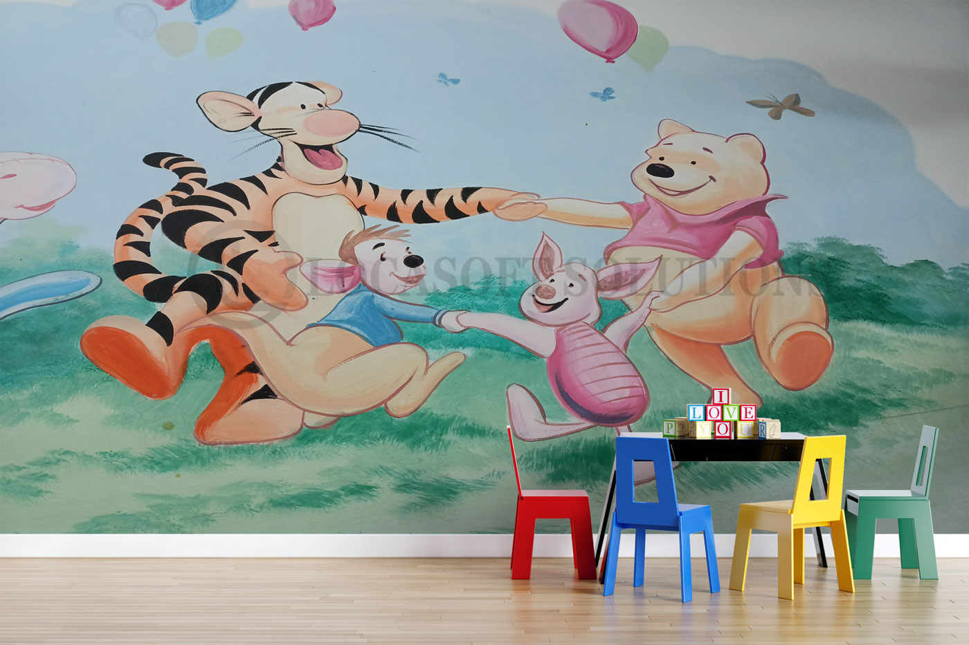 Une fresque murale ludique et colorée qui invite à la joie et à l’imagination.