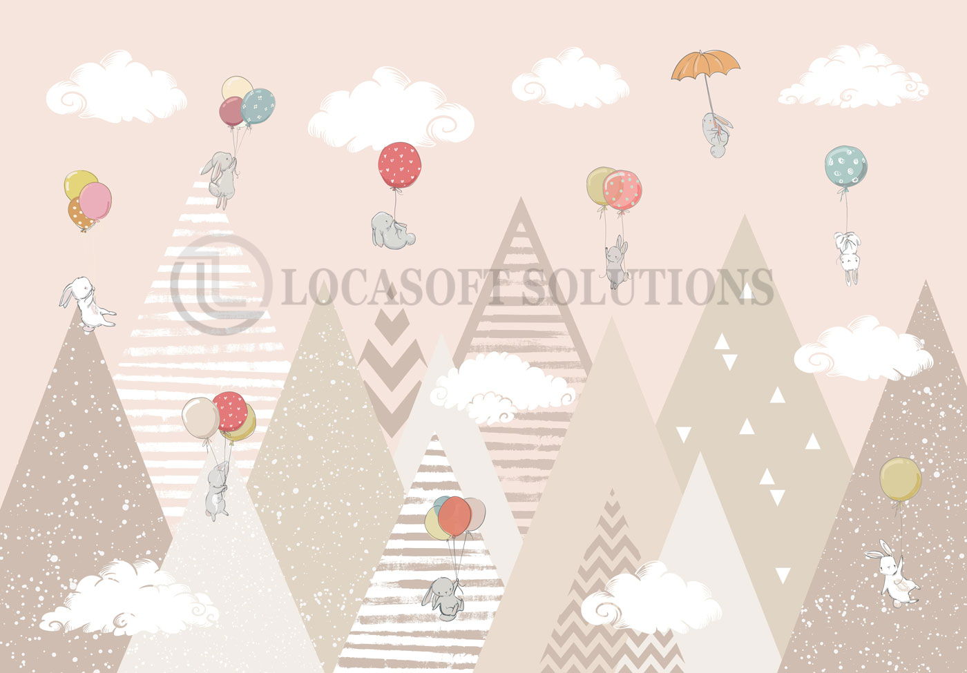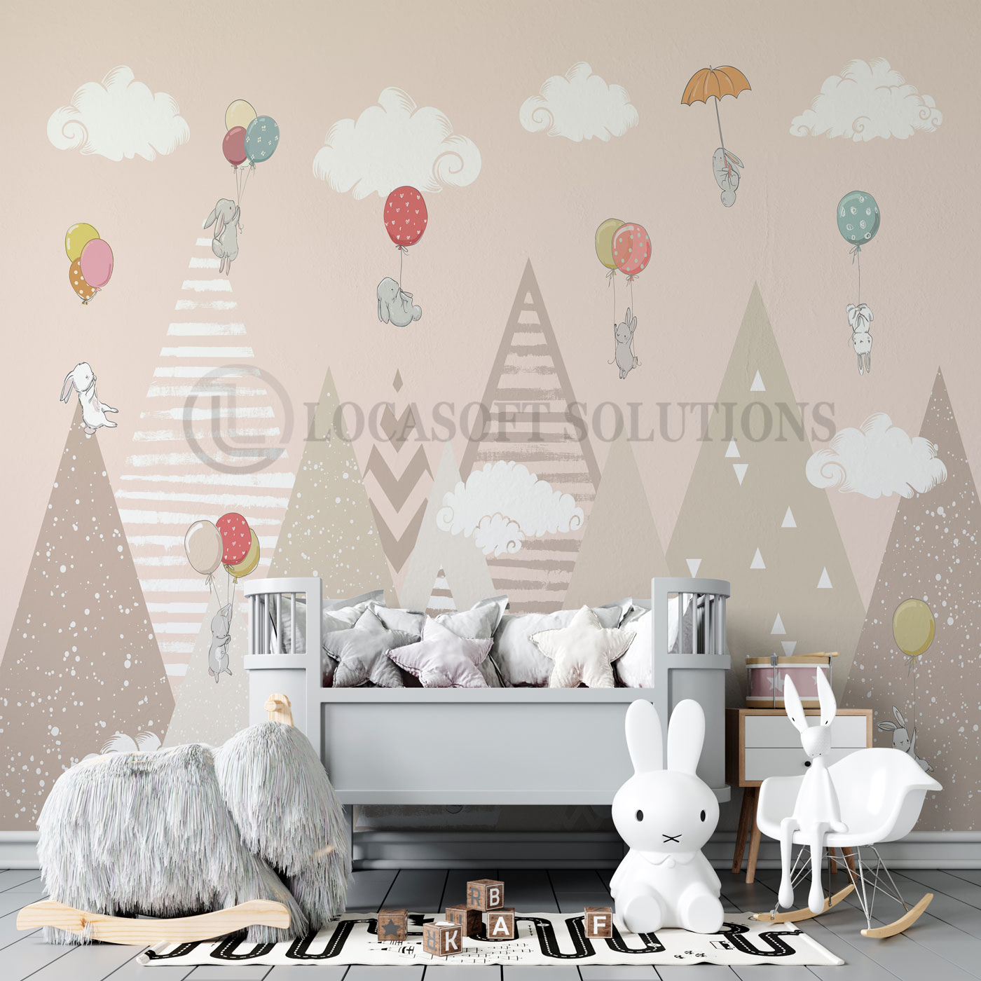 Papier peint enfant lapins et ballons – montagnes scandinaves beige