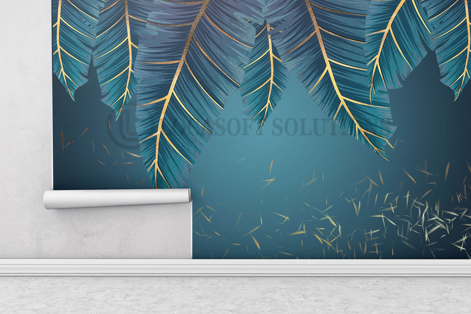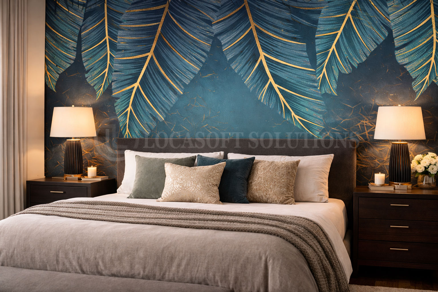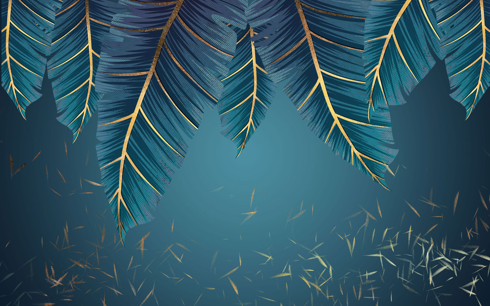Papier peint feuillage bleu et or – Chambre luxueuse