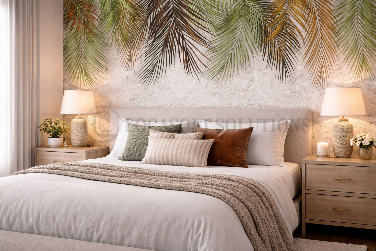Papier peint mural au motif végétal naturel, idéal pour créer une ambiance douce, chaleureuse et relaxante dans la chambre.
