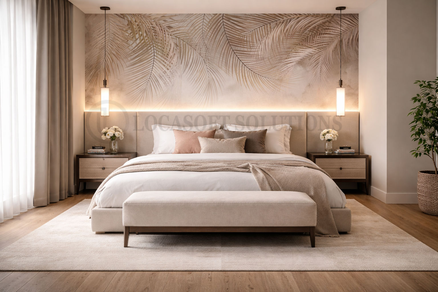 Ce papier peint panoramique au design végétal apporte une touche de sérénité et de chaleur à votre intérieur. Ses nuances beige et sable, associées à des feuilles fines et élégantes, créent une atmosphère apaisante, parfaite pour une chambre moderne et élégante.