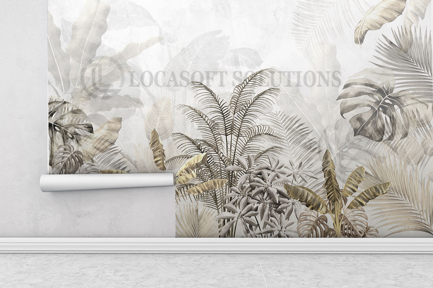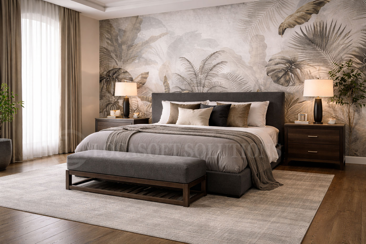 Ce papier peint mural au design jungle élégant apporte une atmosphère apaisante et sophistiquée à votre intérieur. Les nuances de beige, taupe et gris, associées à des motifs végétaux subtils, créent un décor harmonieux et intemporel, parfait pour une chambre moderne.