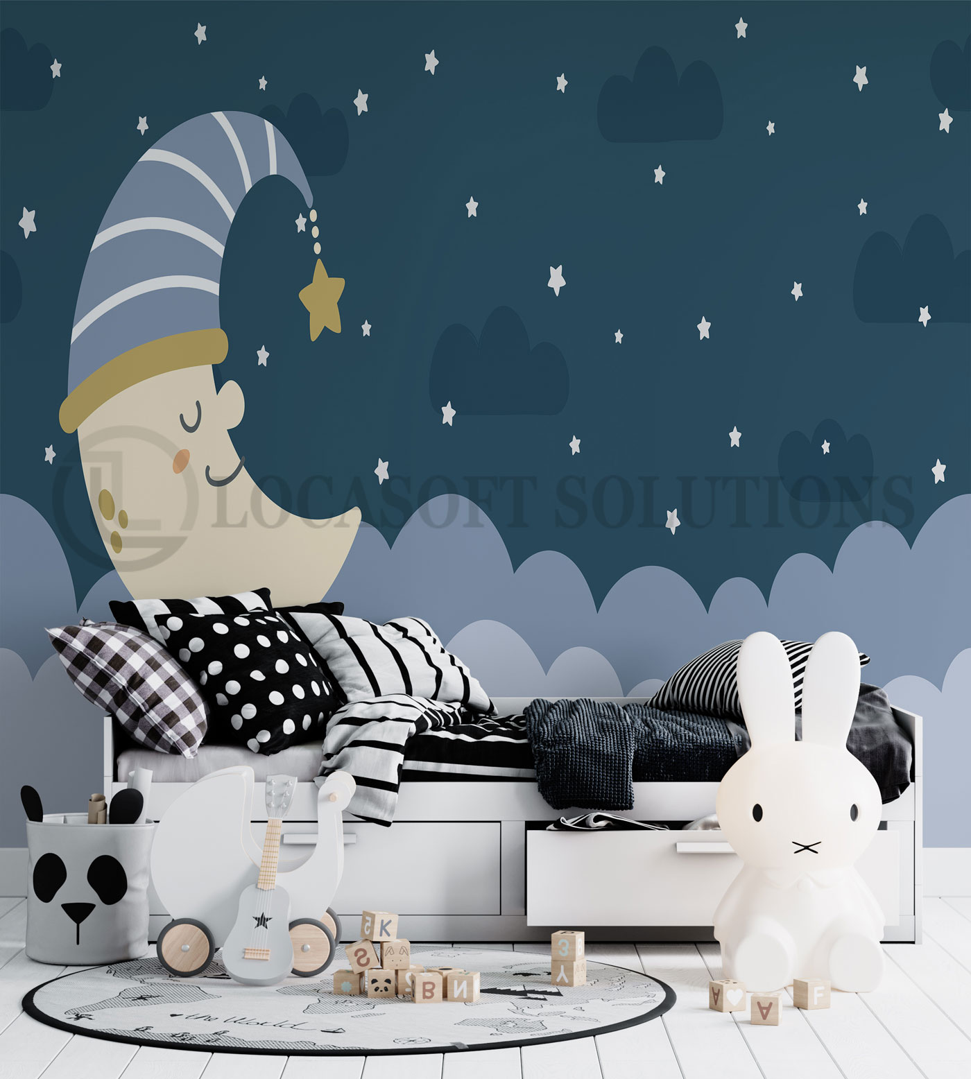 Papier peint lune endormie – nuit étoilée bleu profond