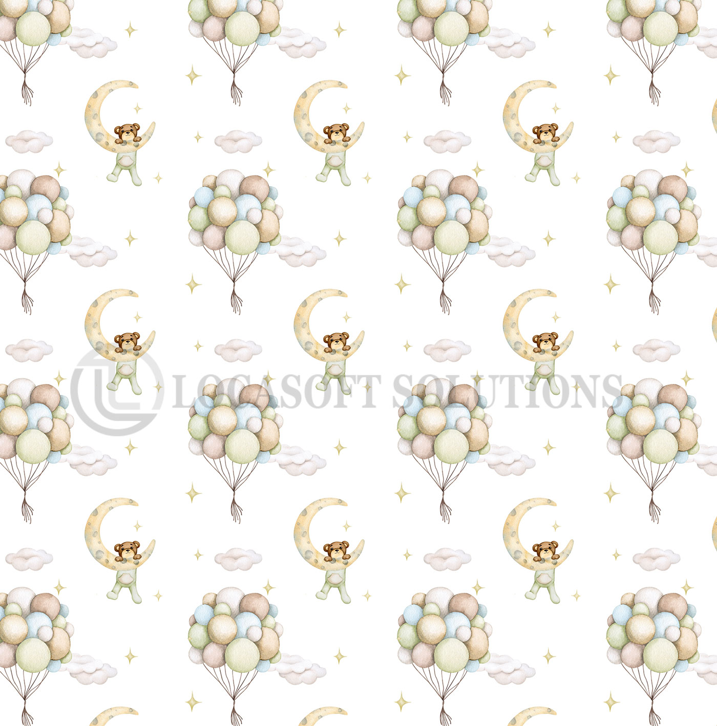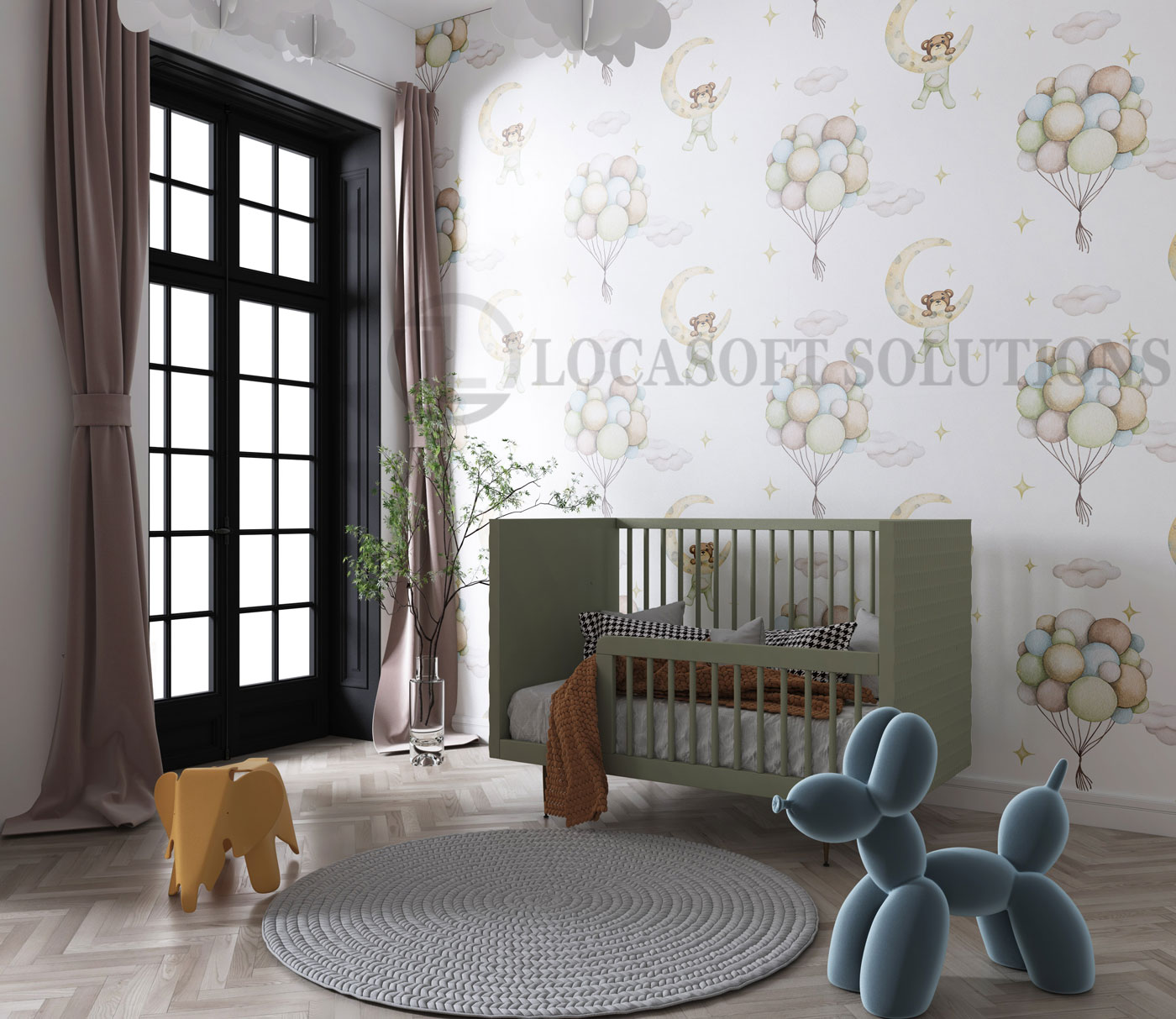 Un motif tendre d’oursons flottant parmi nuages et ballons pour une chambre bébé douce et rassurante.