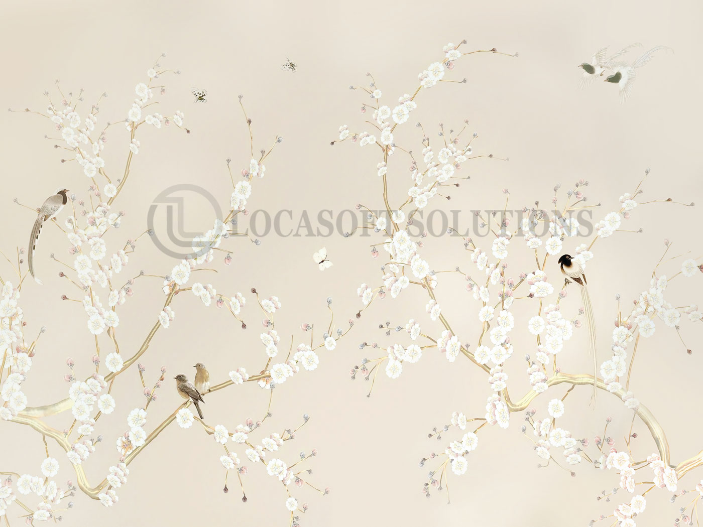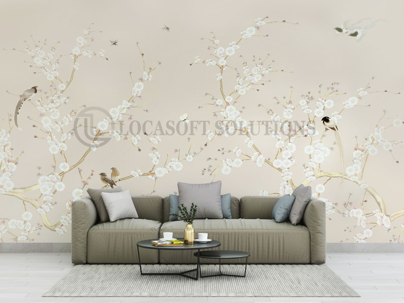 Papier peint panoramique cerisier japonais et oiseaux – élégance zen
