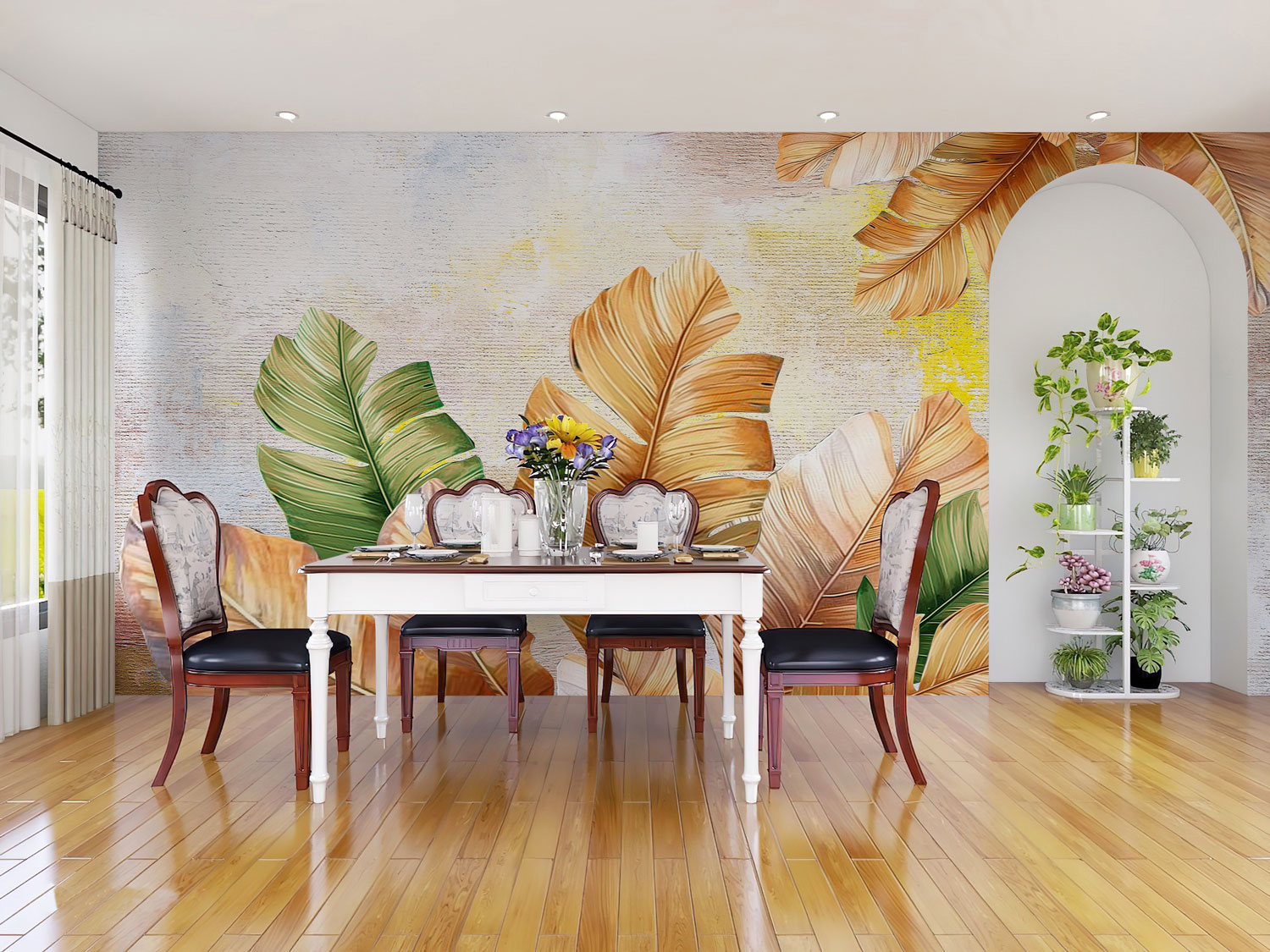 Papier peint mural panoramique aux feuilles tropicales dorées, idéal pour sublimer une salle à manger moderne et chaleureuse.