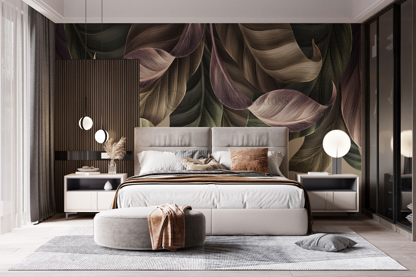 Un décor mural végétal profond et sophistiqué pour une chambre moderne et chaleureuse.