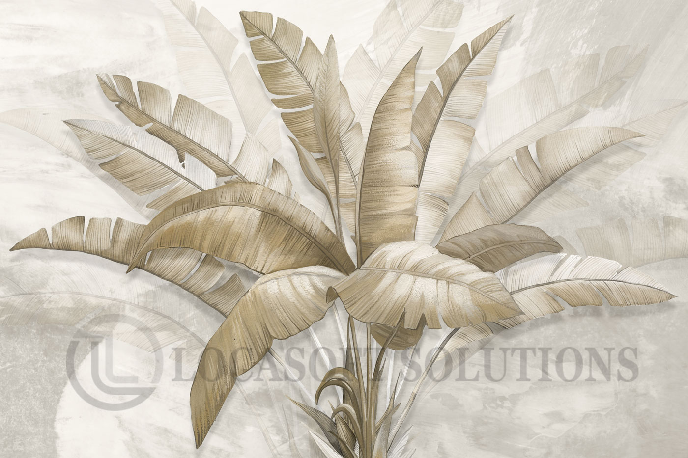 Bring a soft and natural atmosphere to your interior with this panoramic wallpaper representing delicately designed tropical foliage. The large leaves in beige, linen and sand shades stand out against a light, slightly textured background, creating a refined and timeless wall effect.