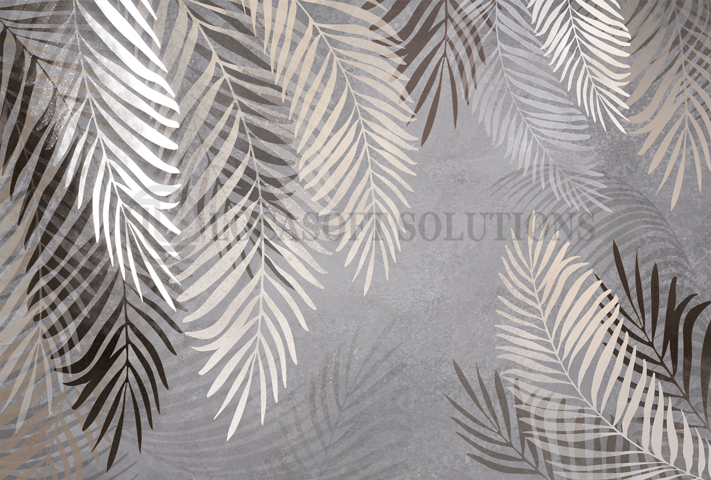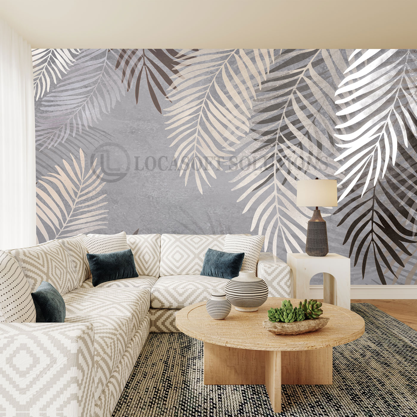 Un décor mural végétal chic aux feuilles tropicales graphiques dans des tons gris et beige élégants.