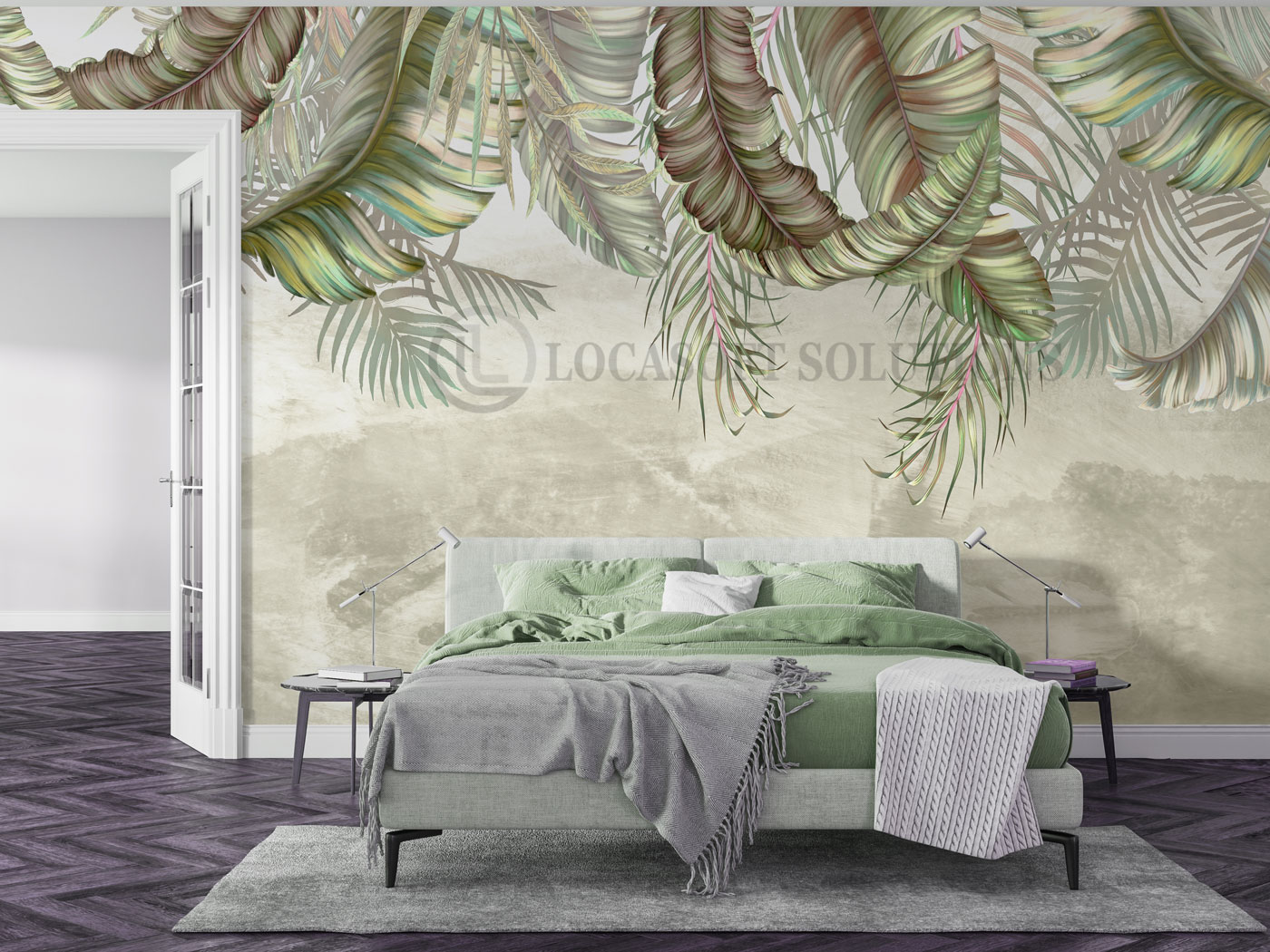 Une fresque végétale douce et lumineuse pour une chambre zen et élégante.