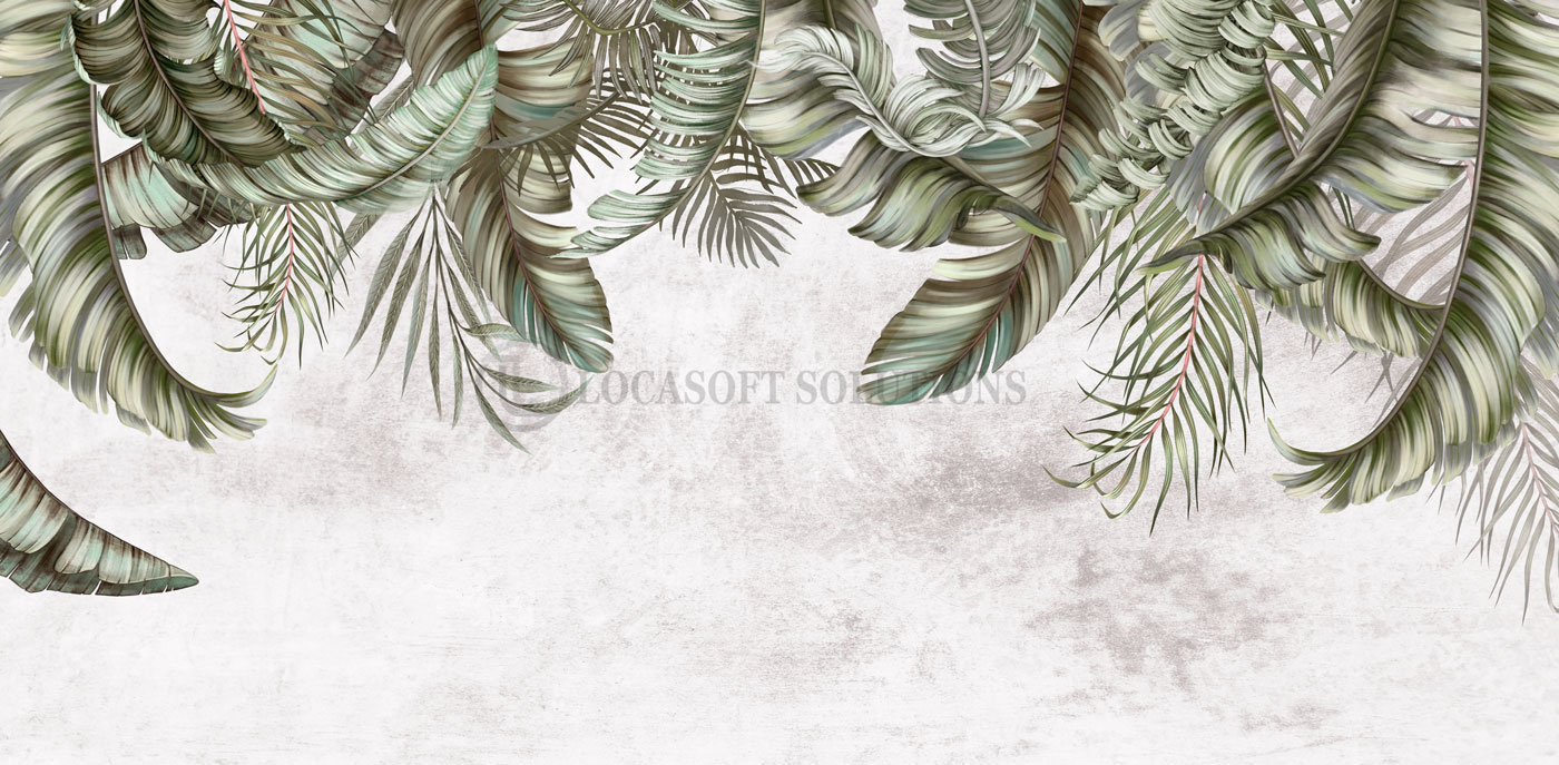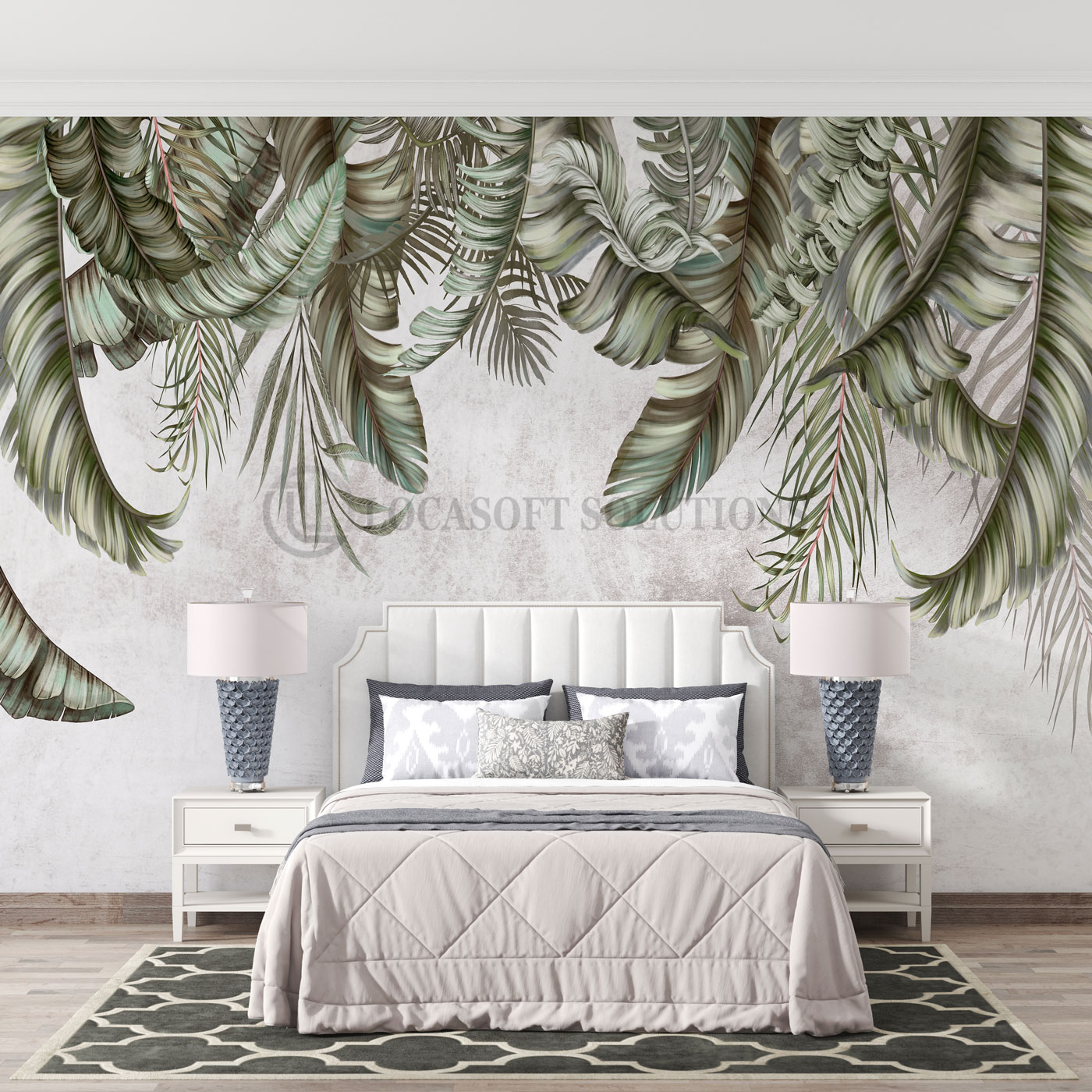 Un panoramique végétal apaisant aux grandes feuilles tropicales vert sauge pour une chambre élégante et relaxante.