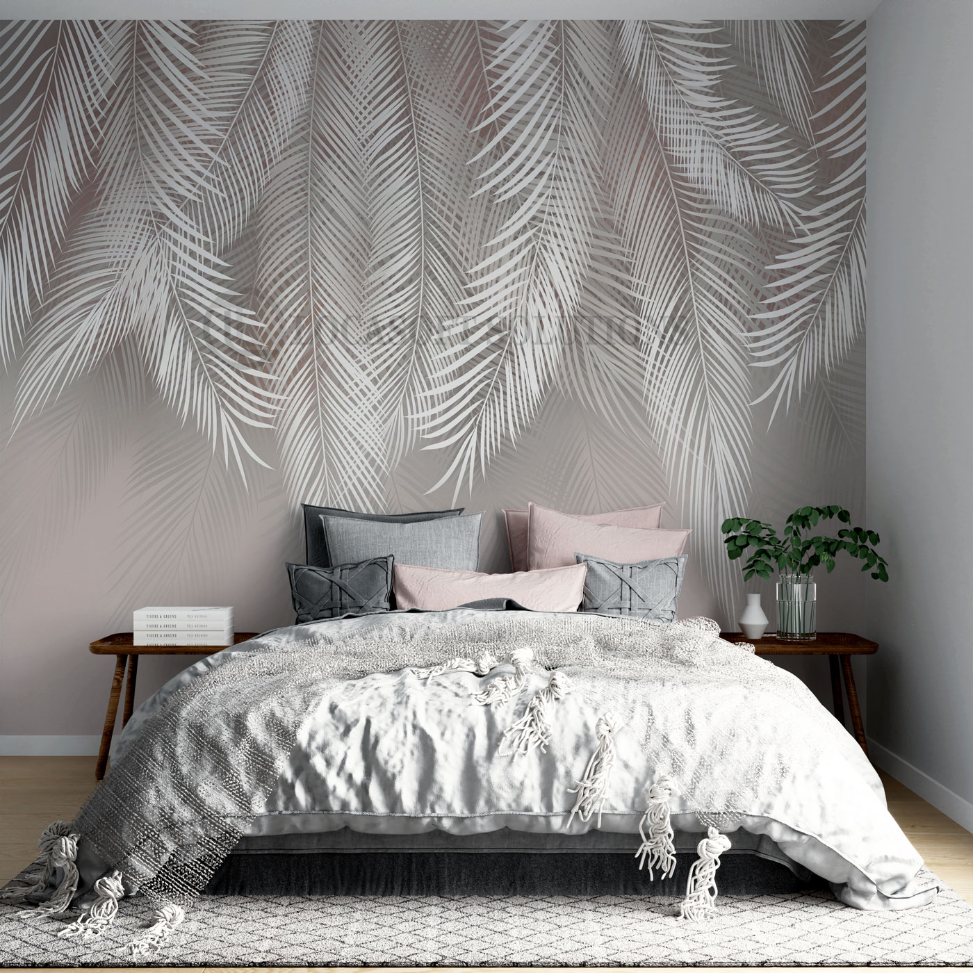 Ce papier peint panoramique met en scène de fines feuilles de palmier aux tons blanc cassé sur un fond beige taupe subtilement texturé. Son design léger et aérien crée une ambiance zen et chaleureuse, idéale pour une chambre ou un espace détente.