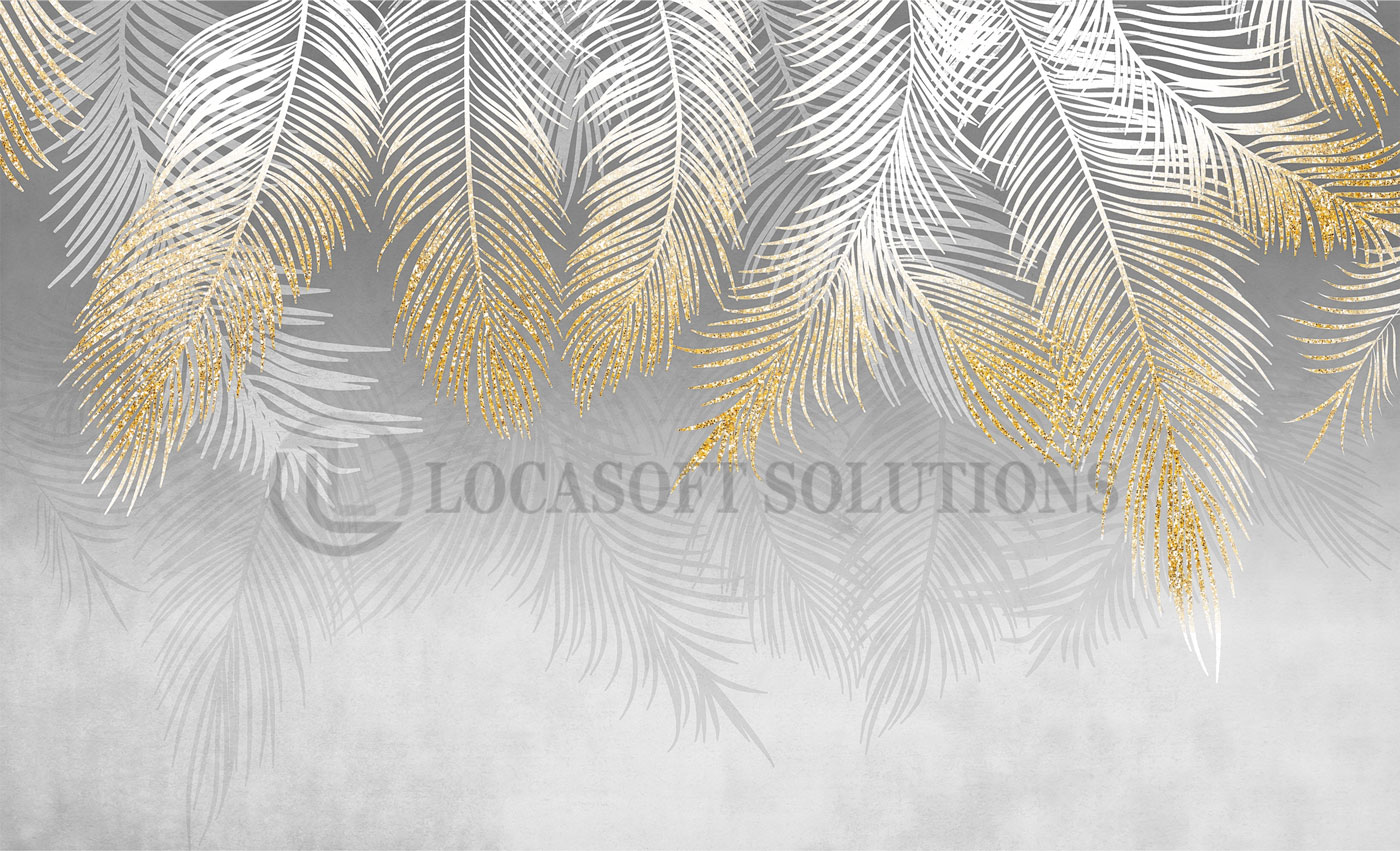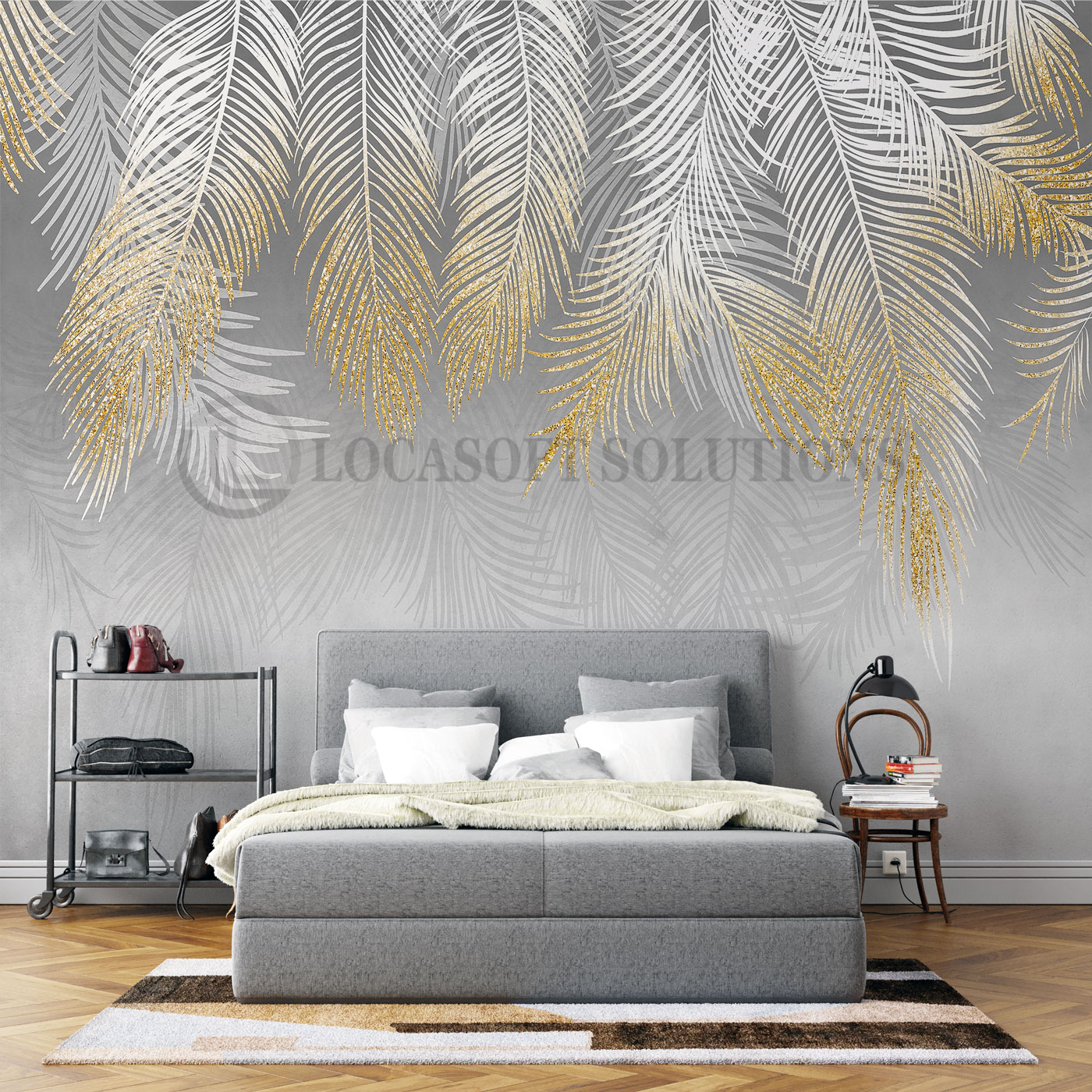 Un décor mural raffiné aux feuilles de palmier argentées rehaussées de touches dorées pour une chambre chic et contemporaine.