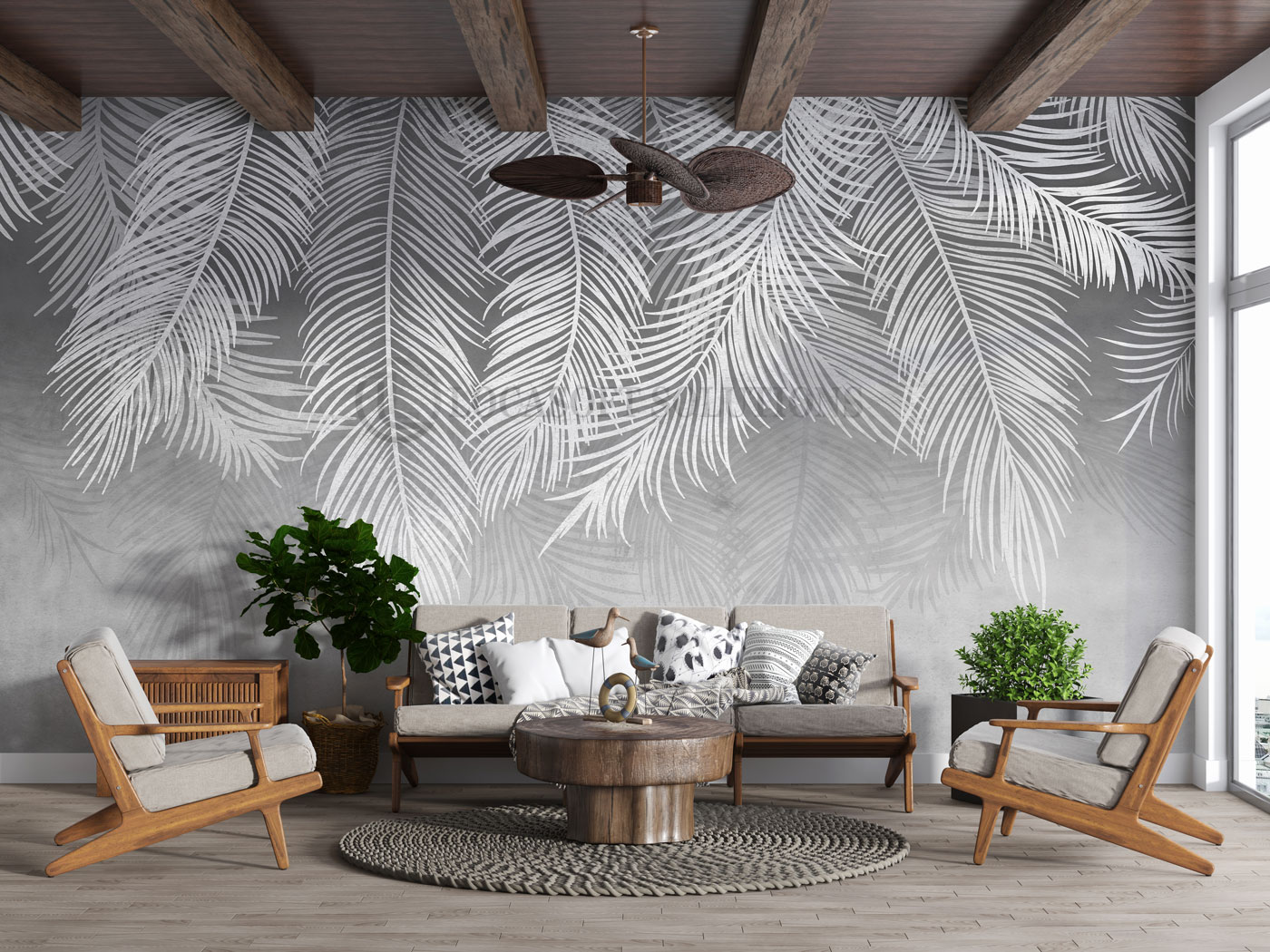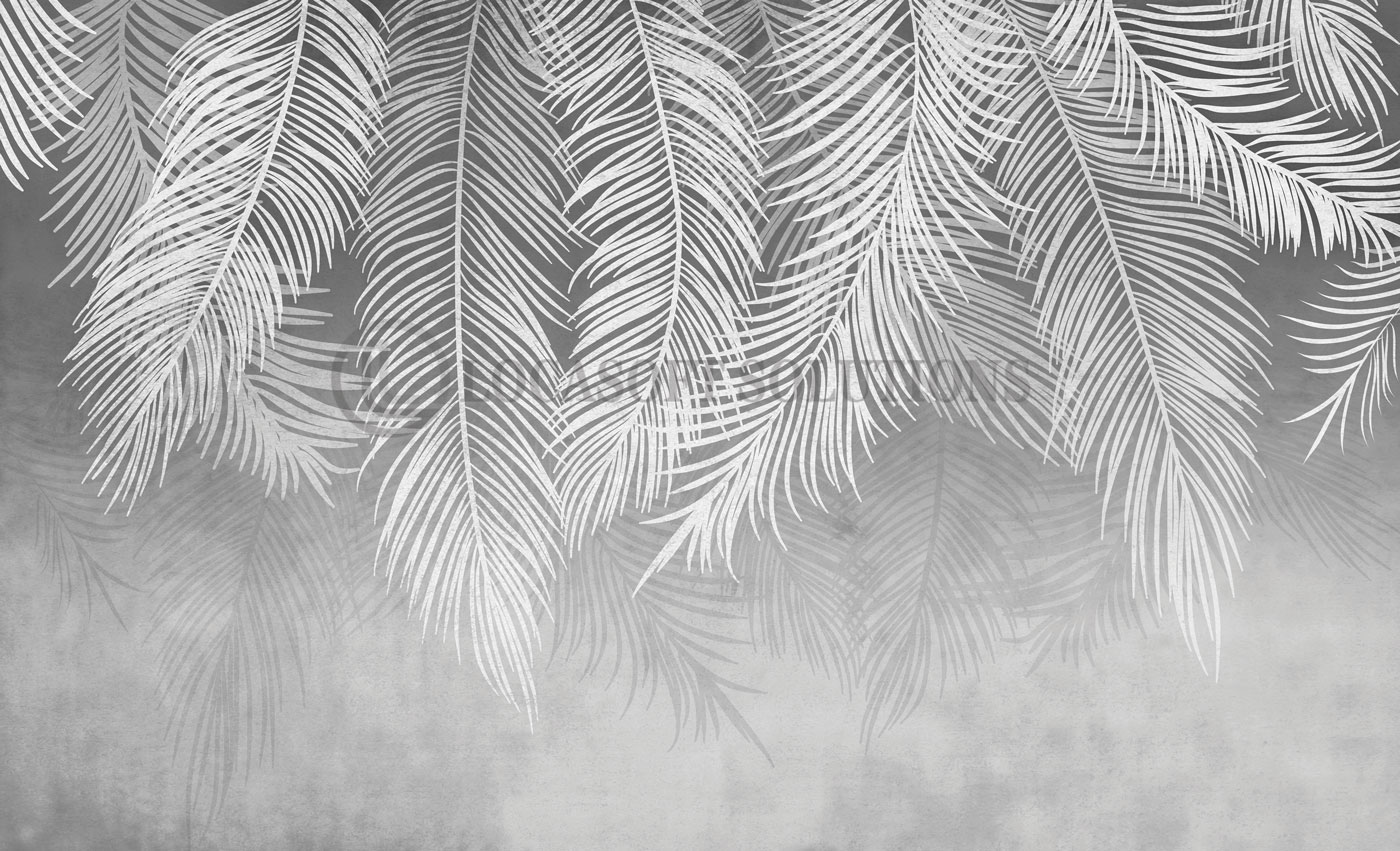 Un décor mural graphique aux grandes feuilles de palmier blanches sur fond minéral gris pour une ambiance naturelle contemporaine.