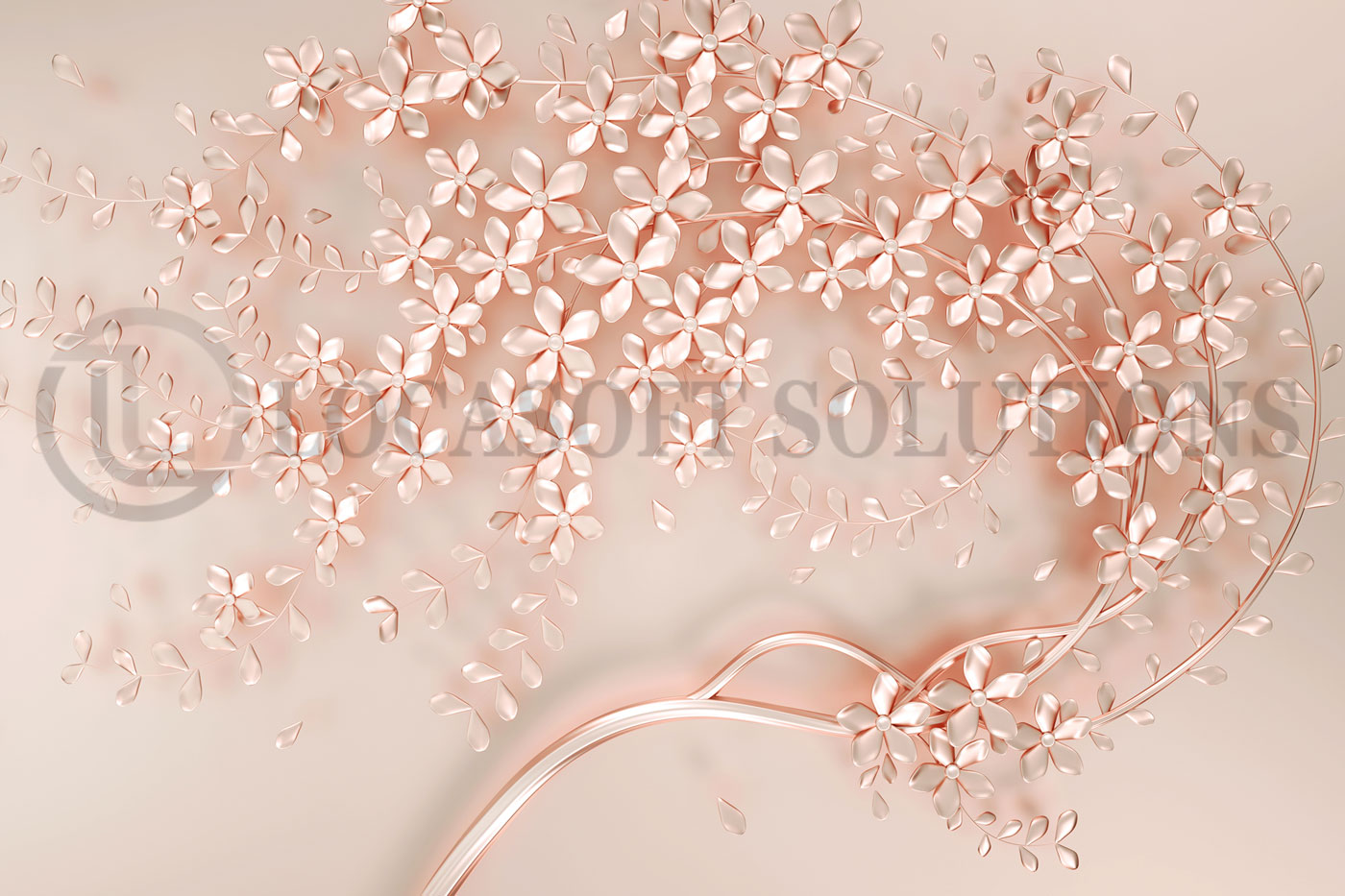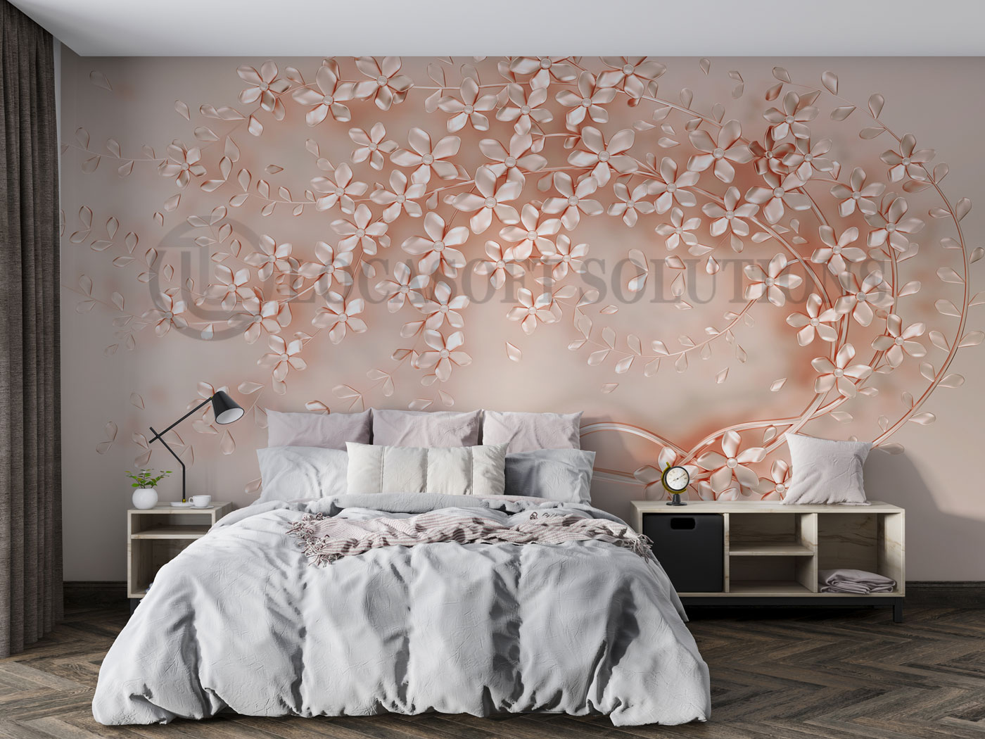 Ce papier peint panoramique met en scène une envolée de fleurs en relief au design 3D raffiné. Ses nuances rose poudré et nacrées diffusent une atmosphère apaisante et romantique, idéale pour transformer la chambre en véritable cocon.