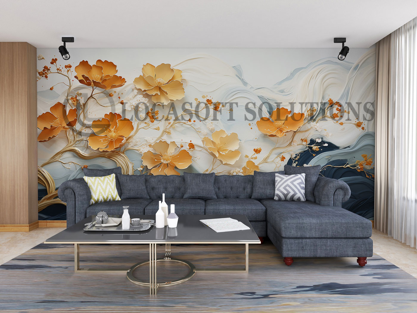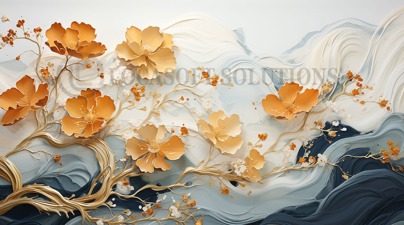 Papier peint panoramique fleurs dorées effet artistique moderne