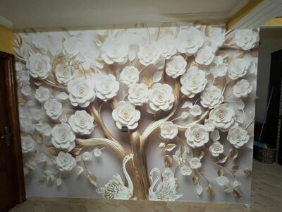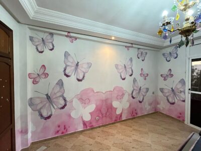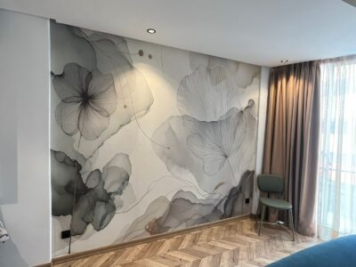 Un mur fleuri délicat aux nuances rosées pour une chambre douce et élégante.