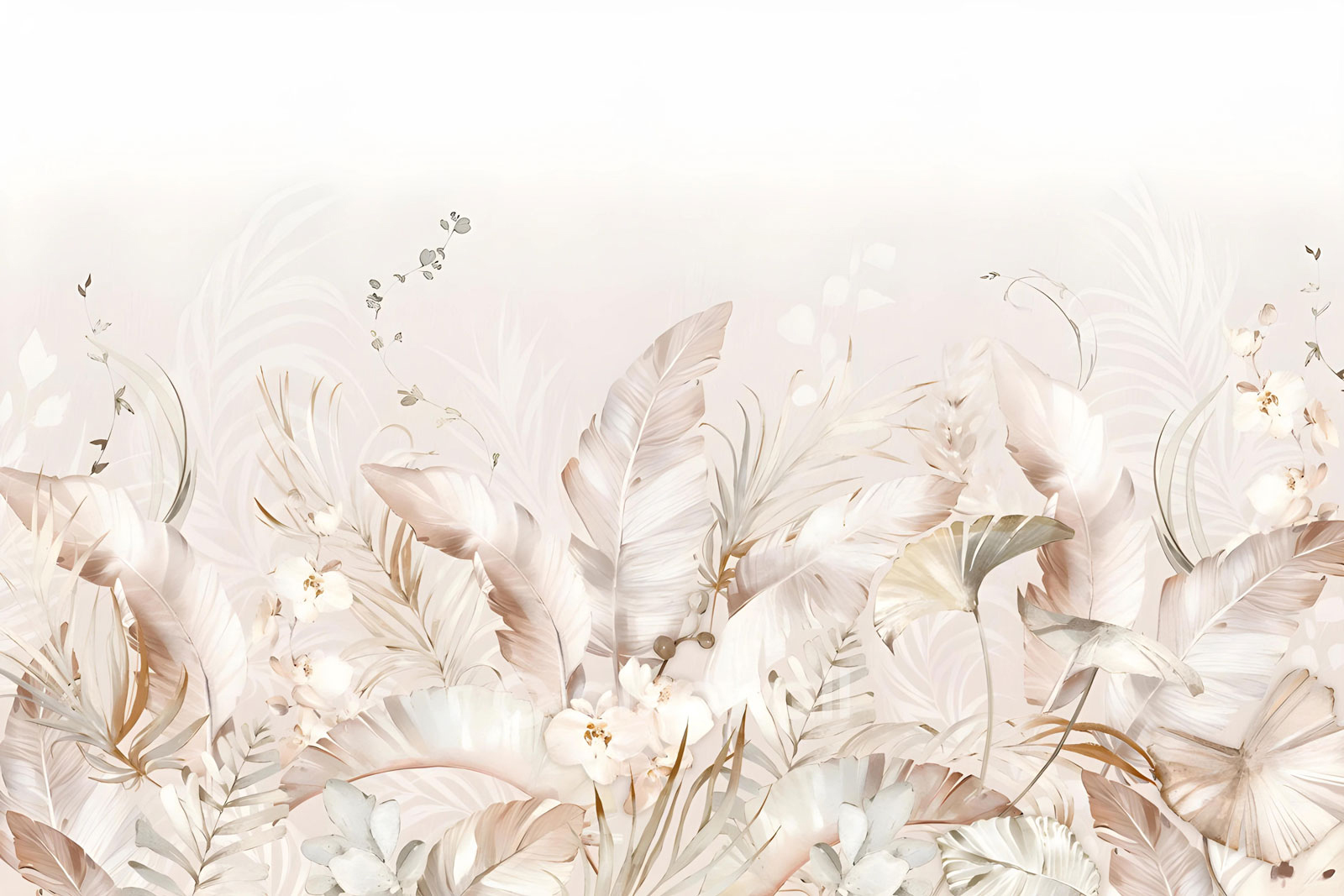 Ce papier peint panoramique floral apporte une touche de douceur et d’élégance à votre intérieur. Les fleurs et feuillages aux tons beiges et nacrés créent une atmosphère apaisante, chaleureuse et sophistiquée, parfaite pour un salon contemporain ou minimaliste.
