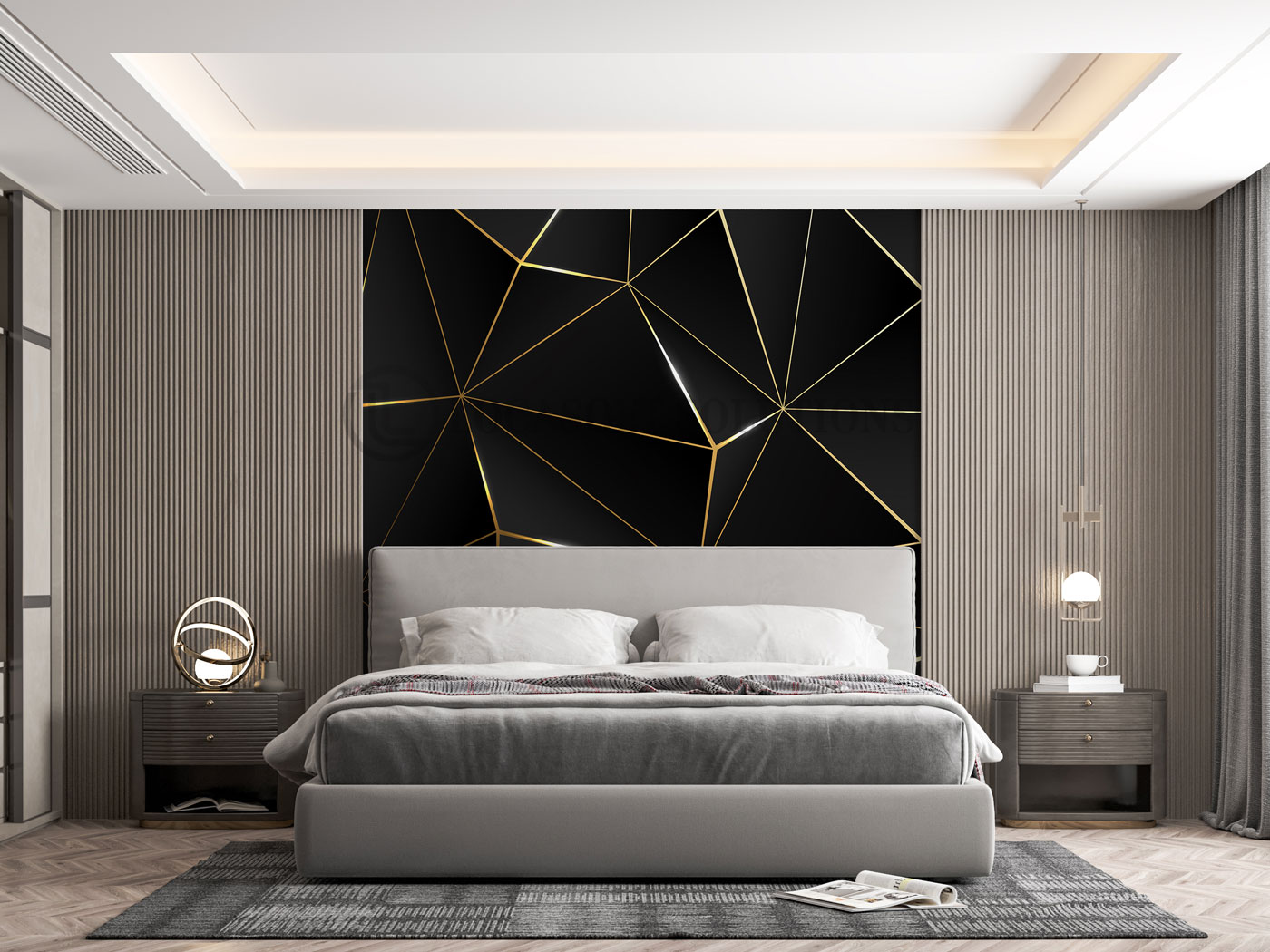 Un décor mural graphique et luxueux pour une chambre moderne au style sophistiqué.