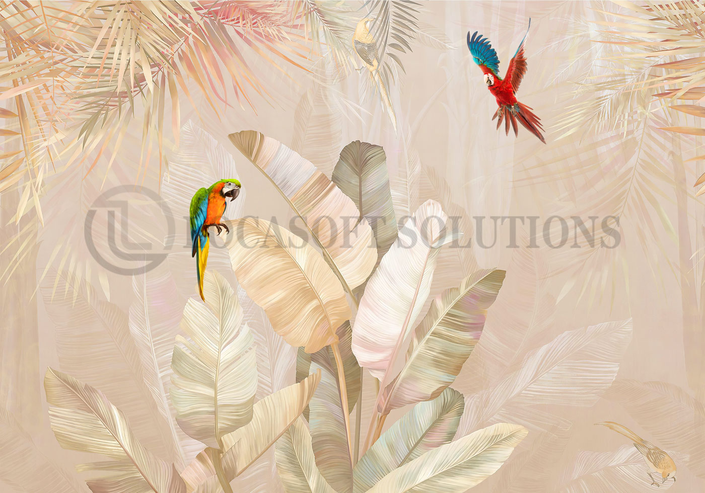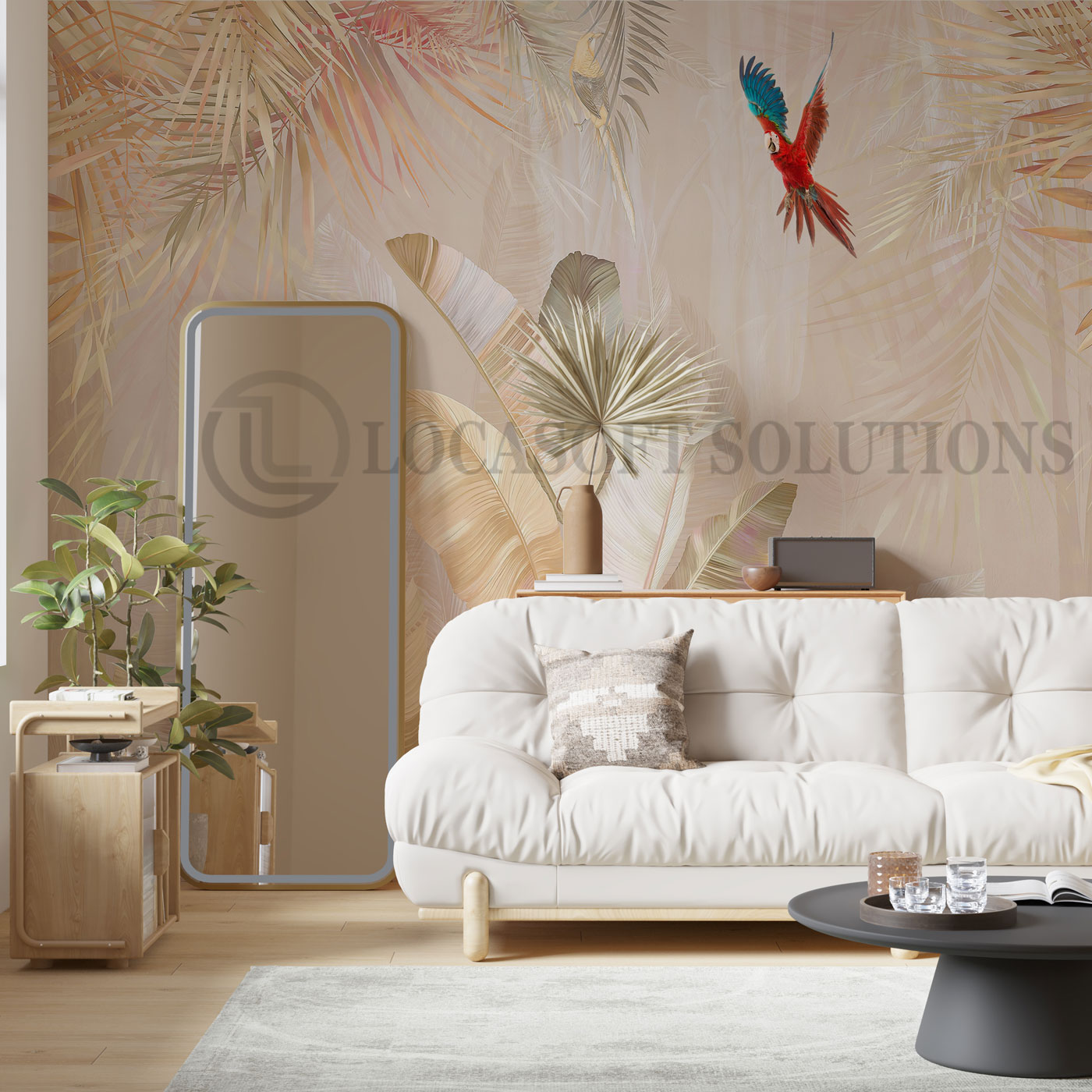 Un décor mural exotique aux feuillages délicats et perroquets colorés, pour une atmosphère tropicale élégante et lumineuse.