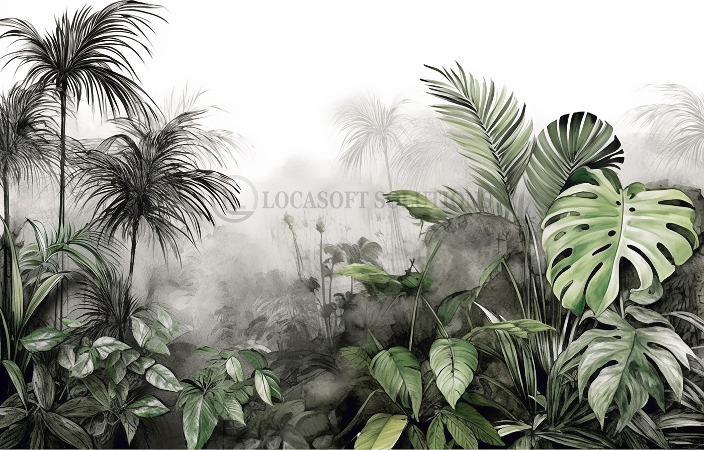 Papier peint panoramique jungle tropicale aquarelle – feuillage exotique brumeux