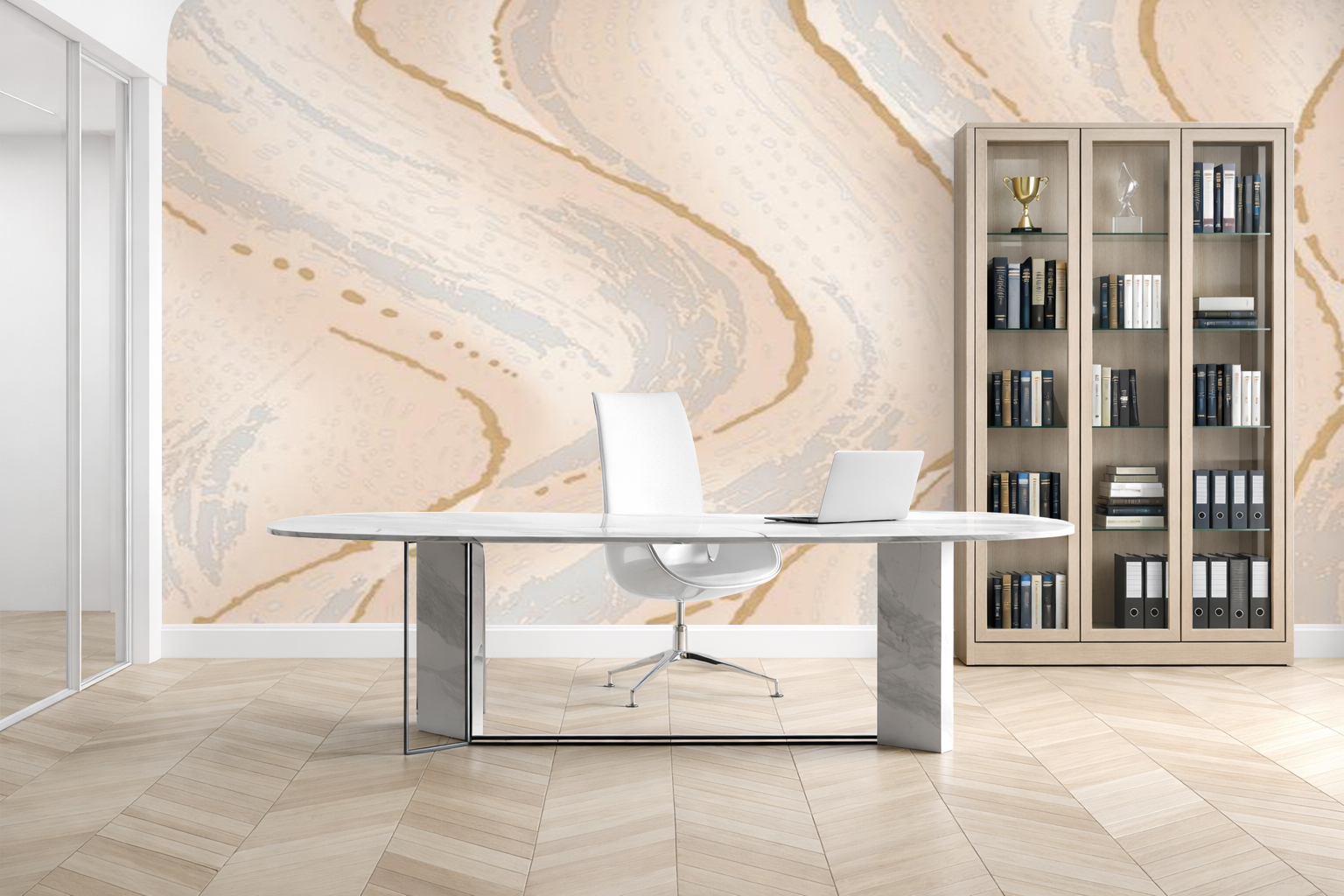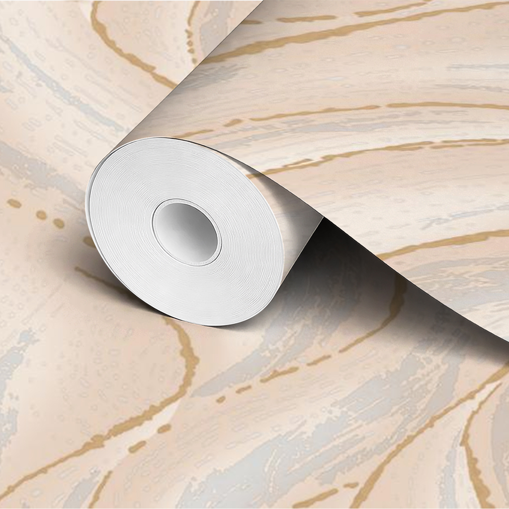 Un papier peint panoramique effet marbre beige aux lignes dorées pour une ambiance chaleureuse et raffinée.