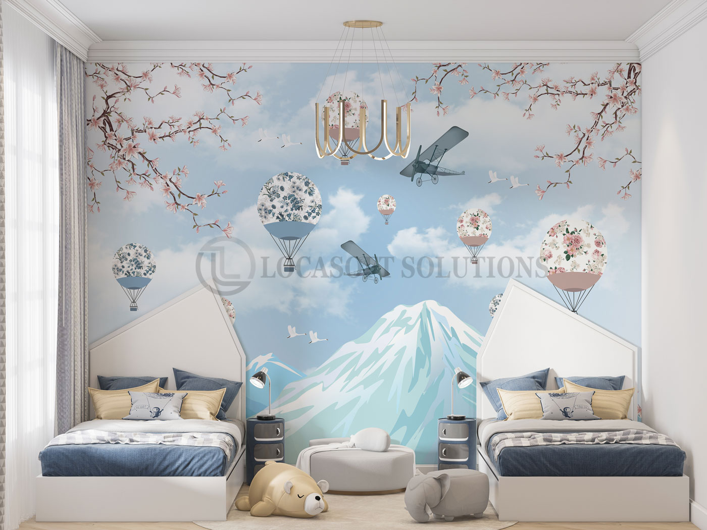Un ciel poétique rempli de montgolfières florales et d’avions pour une chambre d’enfant douce et rêveuse.