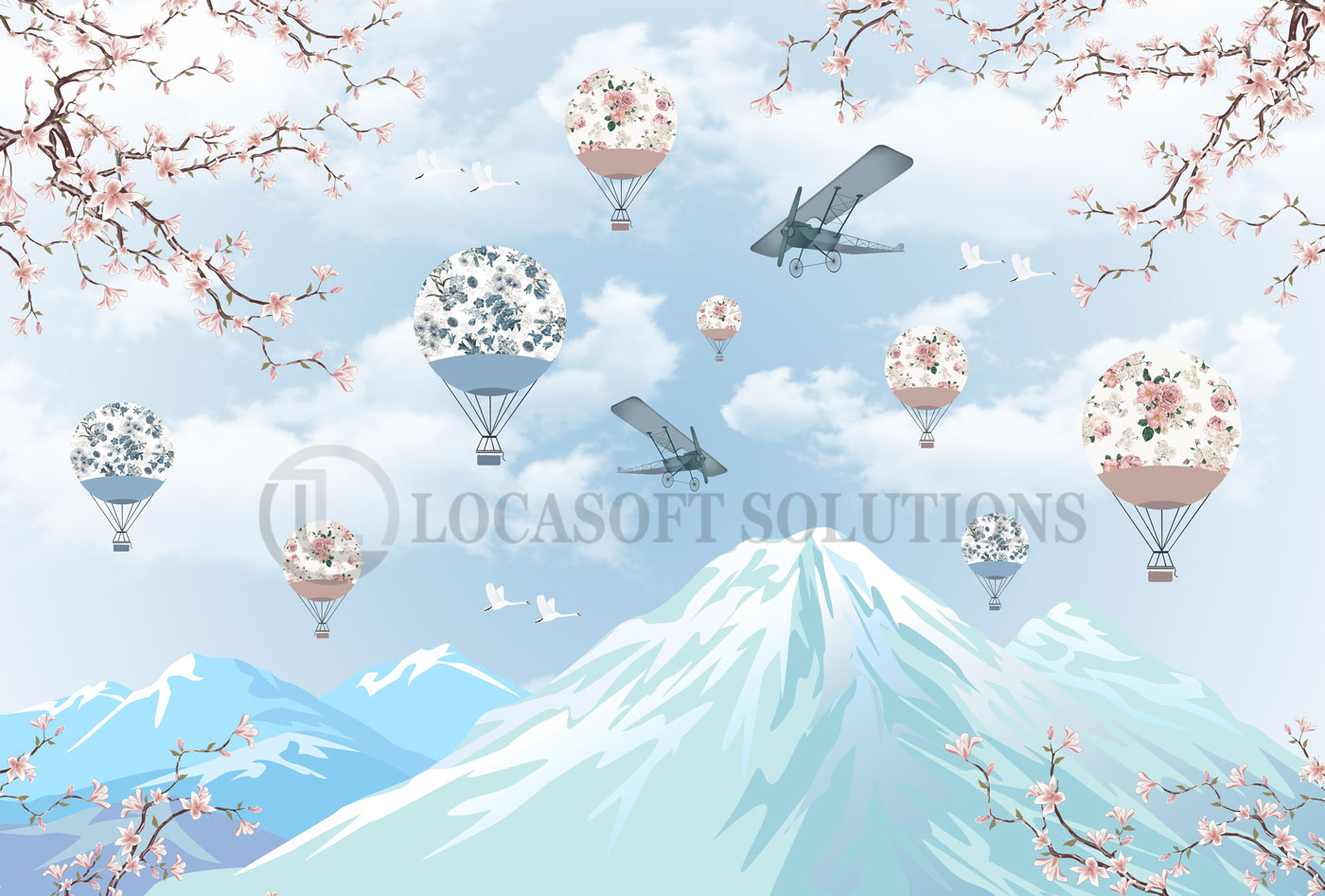 Papier peint panoramique montgolfières fleuries – chambre enfant