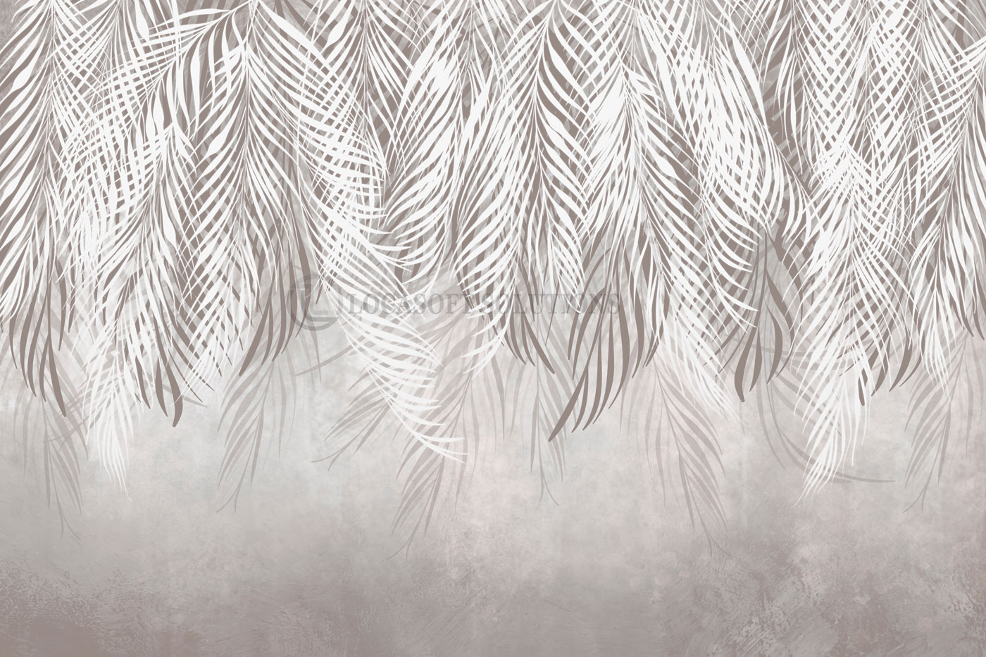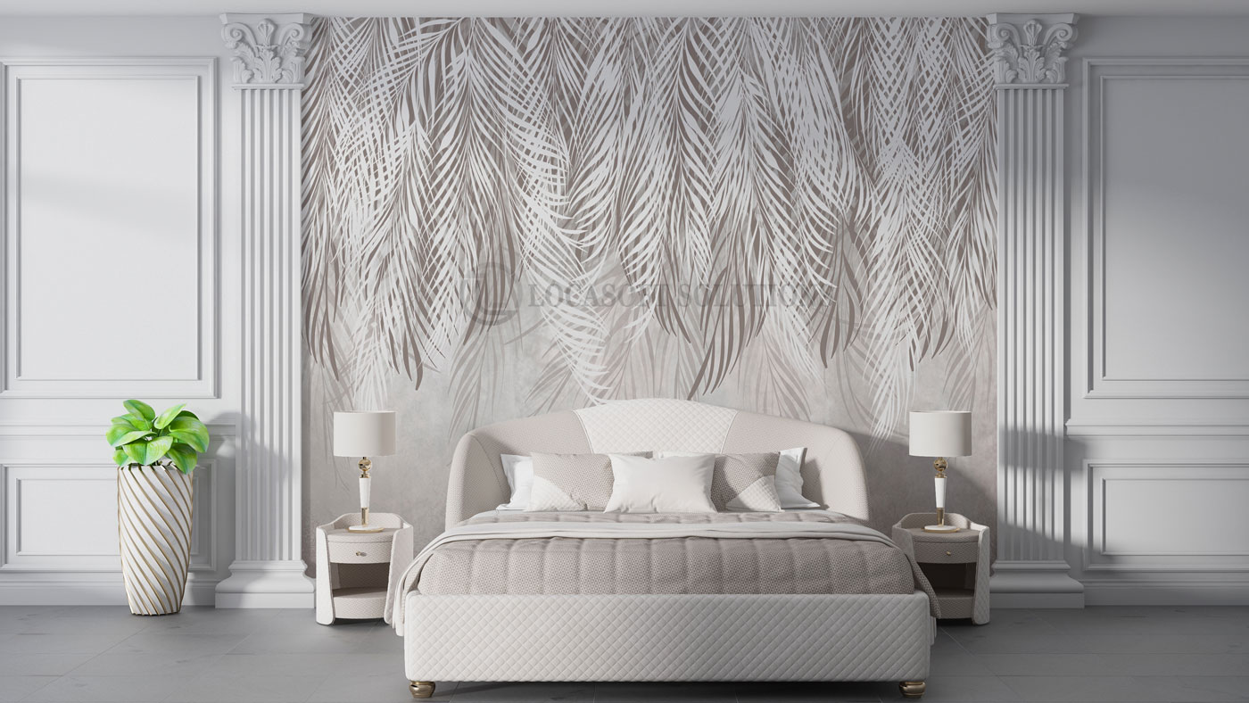 Une fresque murale de plumes beige pour une chambre douce, chic et lumineuse.