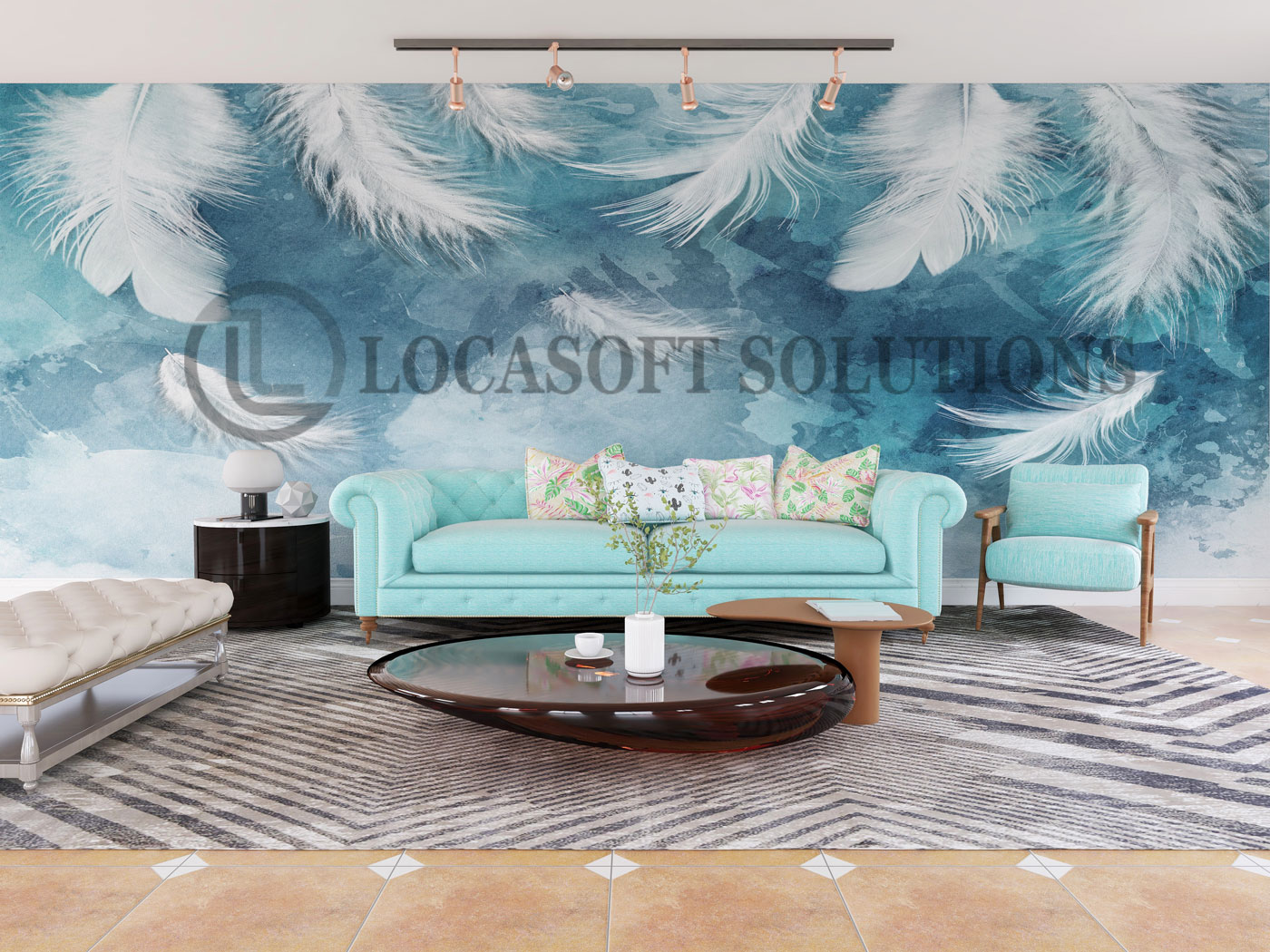 Papier peint mural artistique aux plumes blanches sur fond bleu, idéal pour créer une ambiance douce, moderne et apaisante.