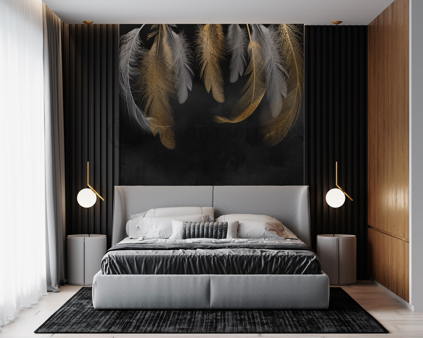 Un décor mural raffiné aux plumes dorées sur fond noir pour une ambiance élégante et sophistiquée.