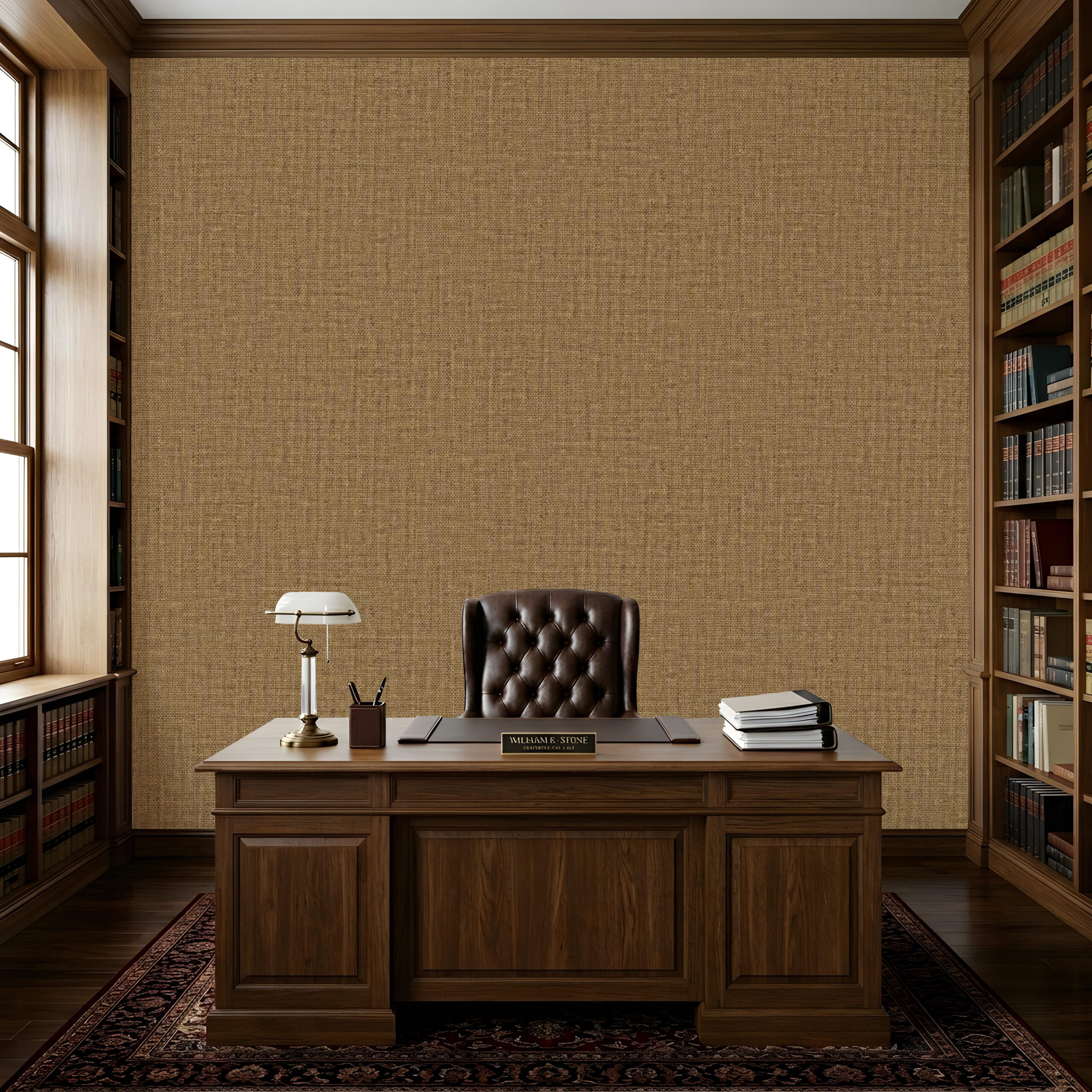 Un papier peint brun texturé effet fibre naturelle qui apporte chaleur et élégance à un bureau classique.