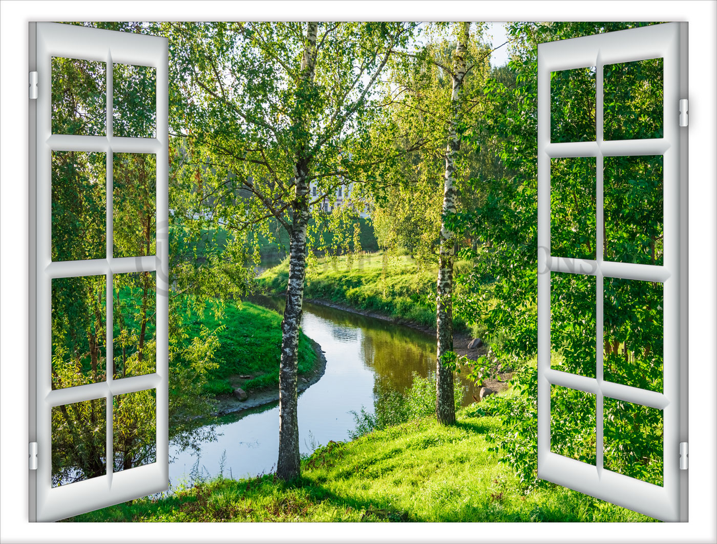 Ce papier peint panoramique crée l’illusion parfaite d’une grande fenêtre ouverte sur un paysage verdoyant traversé par une rivière paisible. Grâce à son effet trompe-l’œil réaliste, il apporte profondeur et luminosité à votre intérieur tout en donnant la sensation d’une pièce prolongée vers l’extérieur.