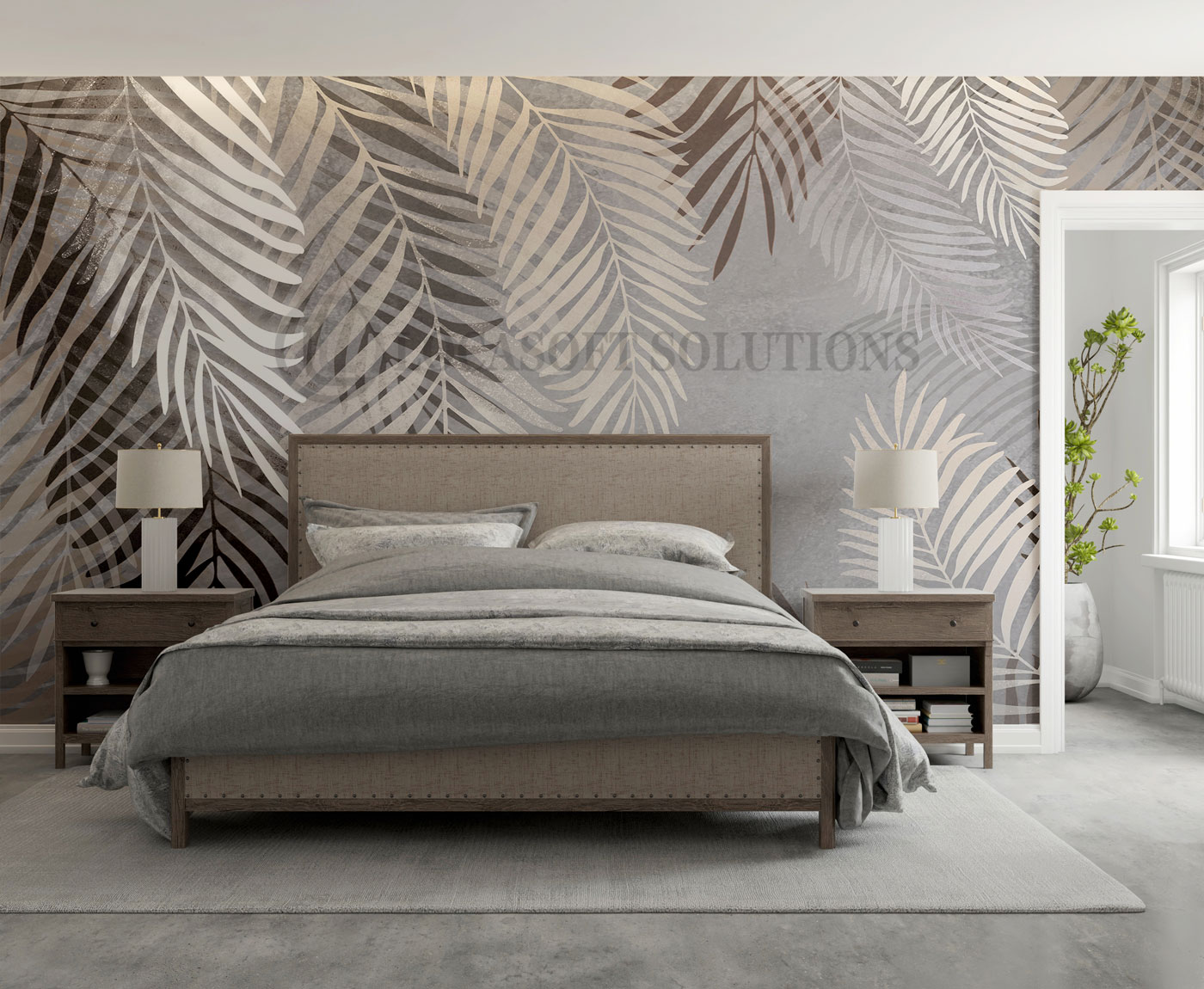 Une fresque végétale douce et élégante pour une chambre apaisante et chaleureuse.